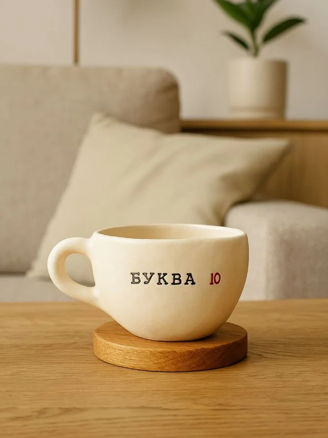 Керамическая кружка ручной работы с надписью «Буква Ю». Производитель - петербургская керамистка Аня Мурмыло (Keramurrr).