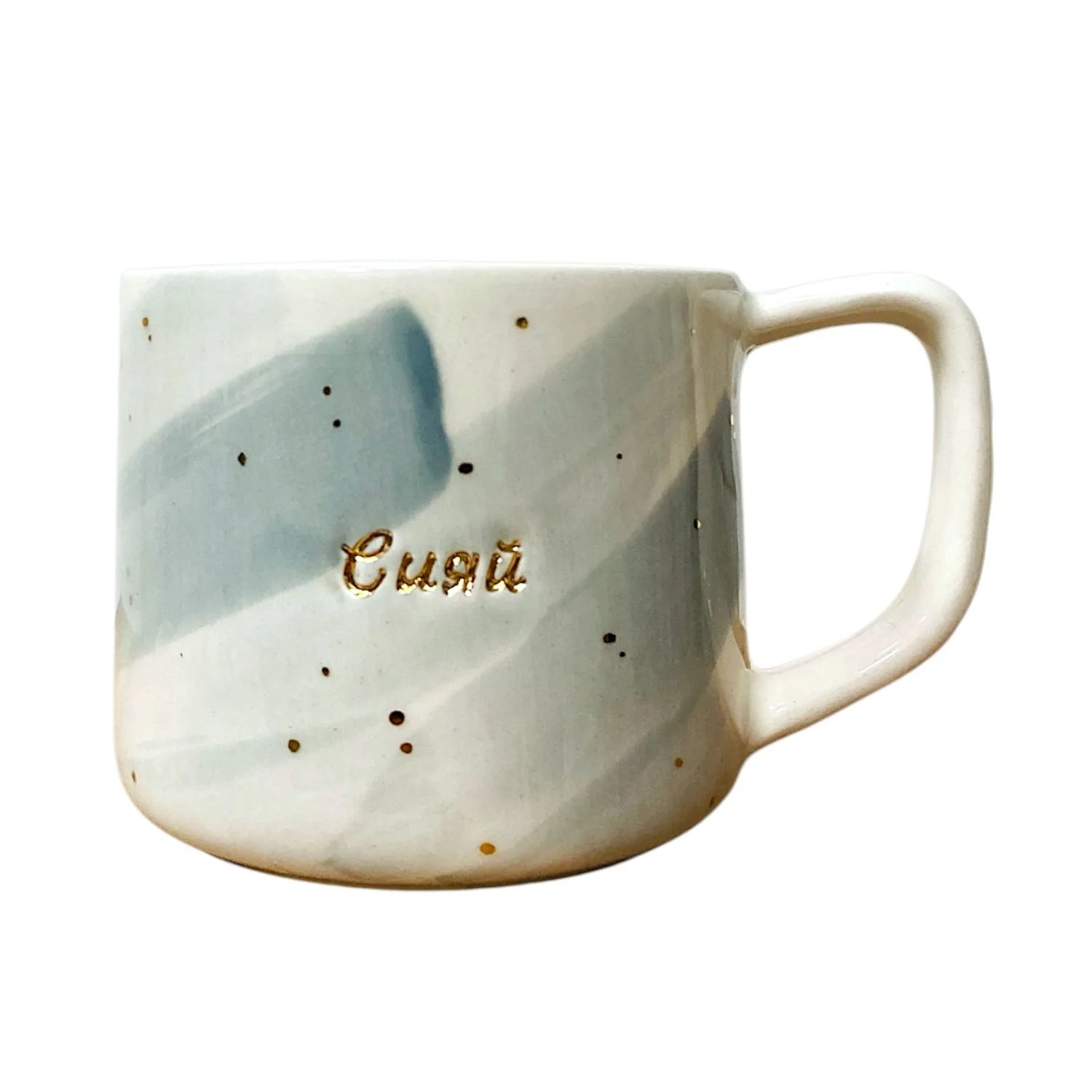 Кружка ручной работы Анна Герман с надписью и разводами «Сияй», бело-голубая, фарфор, 300 мл