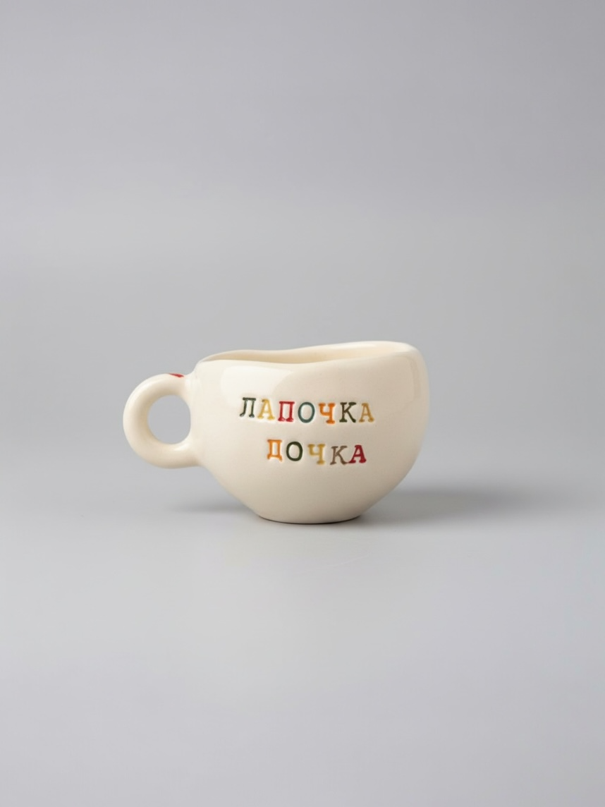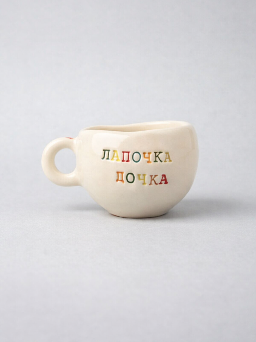 Керамическая кружка ручной работы с надписью «Лапочка дочка». Производитель - петербургская керамистка Аня Мурмыло (Keramurrr).