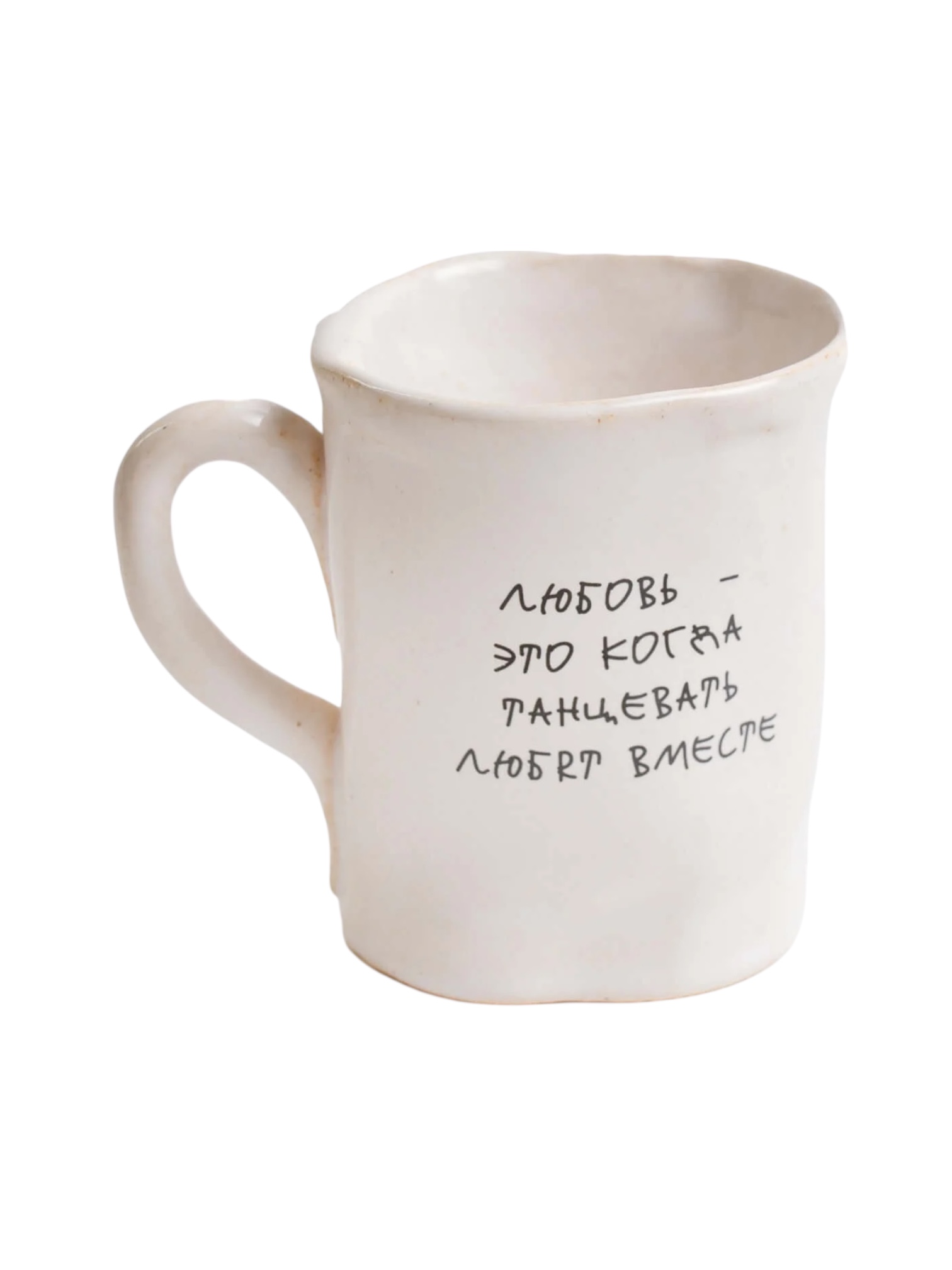 Кружка ручной работы с надписью «Любовь - это когда танцевать любят вместе» изготовлена вручную керамистами Благотворительного фонда Антон тут рядом.