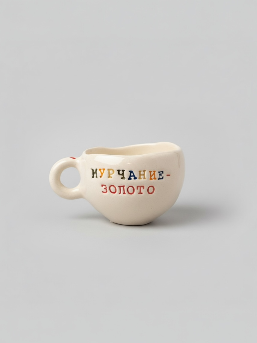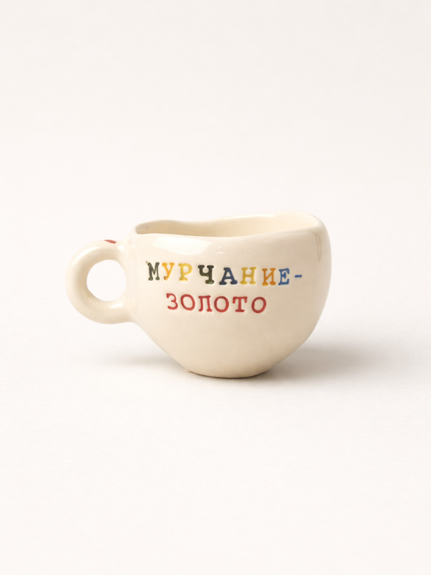 Керамическая кружка ручной работы с надписью «Мурчание-золото». Производитель - петербургская керамистка Аня Мурмыло (Keramurrr).