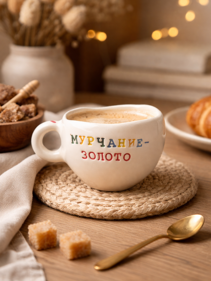 Кружка ручной работы с надписью «Мурчание-золото», керамика, 180 мл
