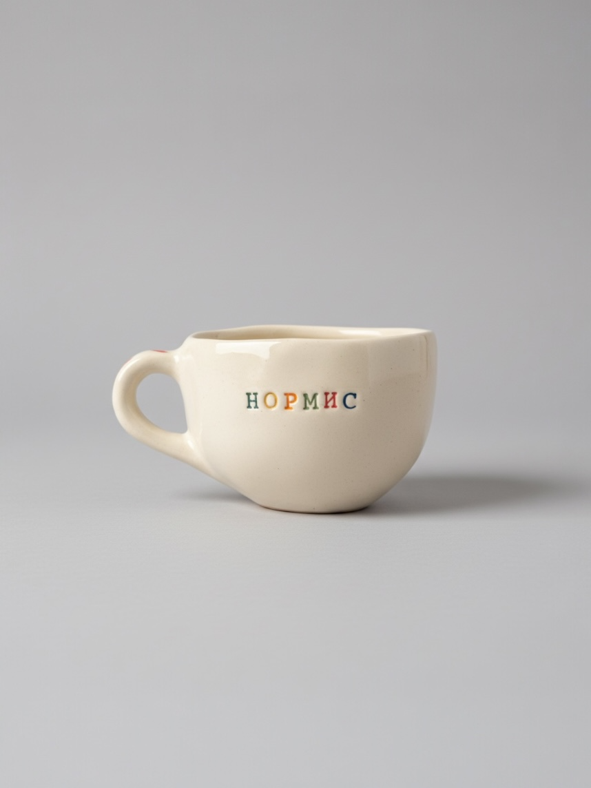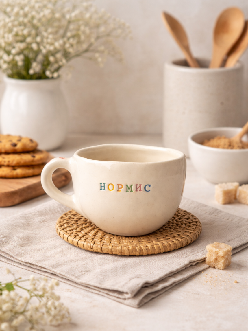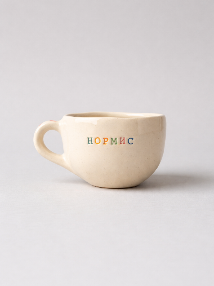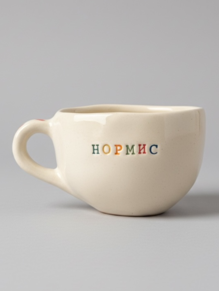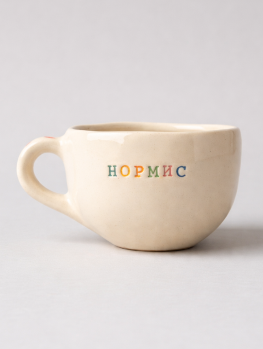 Керамическая кружка ручной работы с надписью «Нормис». Производитель - петербургская керамистка Аня Мурмыло (Keramurrr).