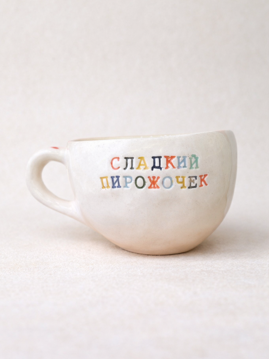 Керамическая кружка ручной работы с надписью «Пирожок». Производитель - петербургская керамистка Аня Мурмыло (Keramurrr).
