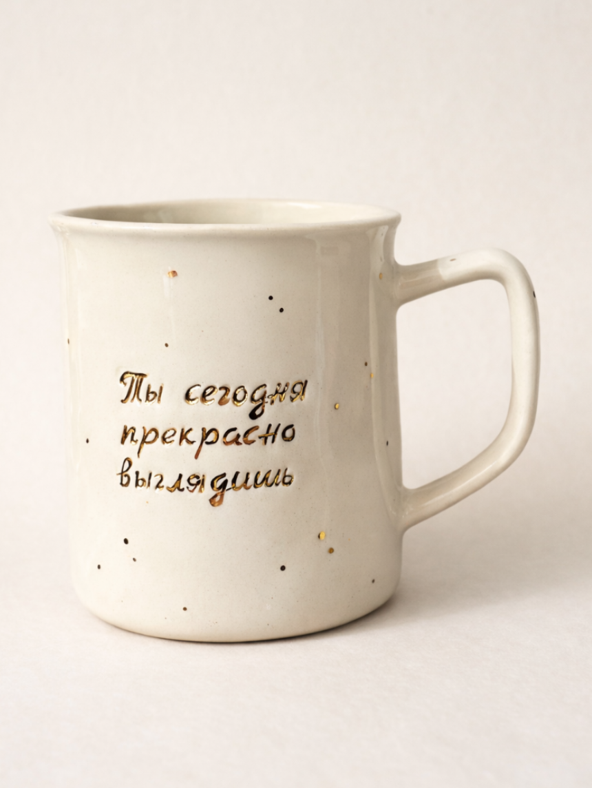 Элегантная фарфоровая кружка с надписью «Ты сегодня прекрасно выглядишь».  Ручная работа от петербургской керамистки Анны Герман.