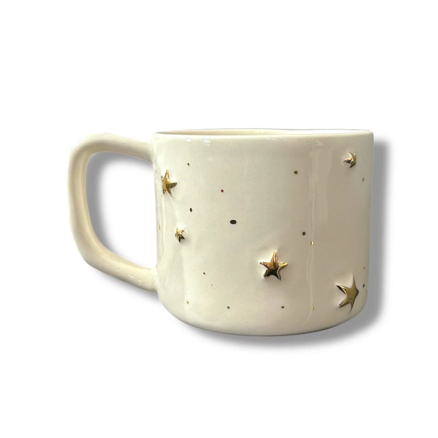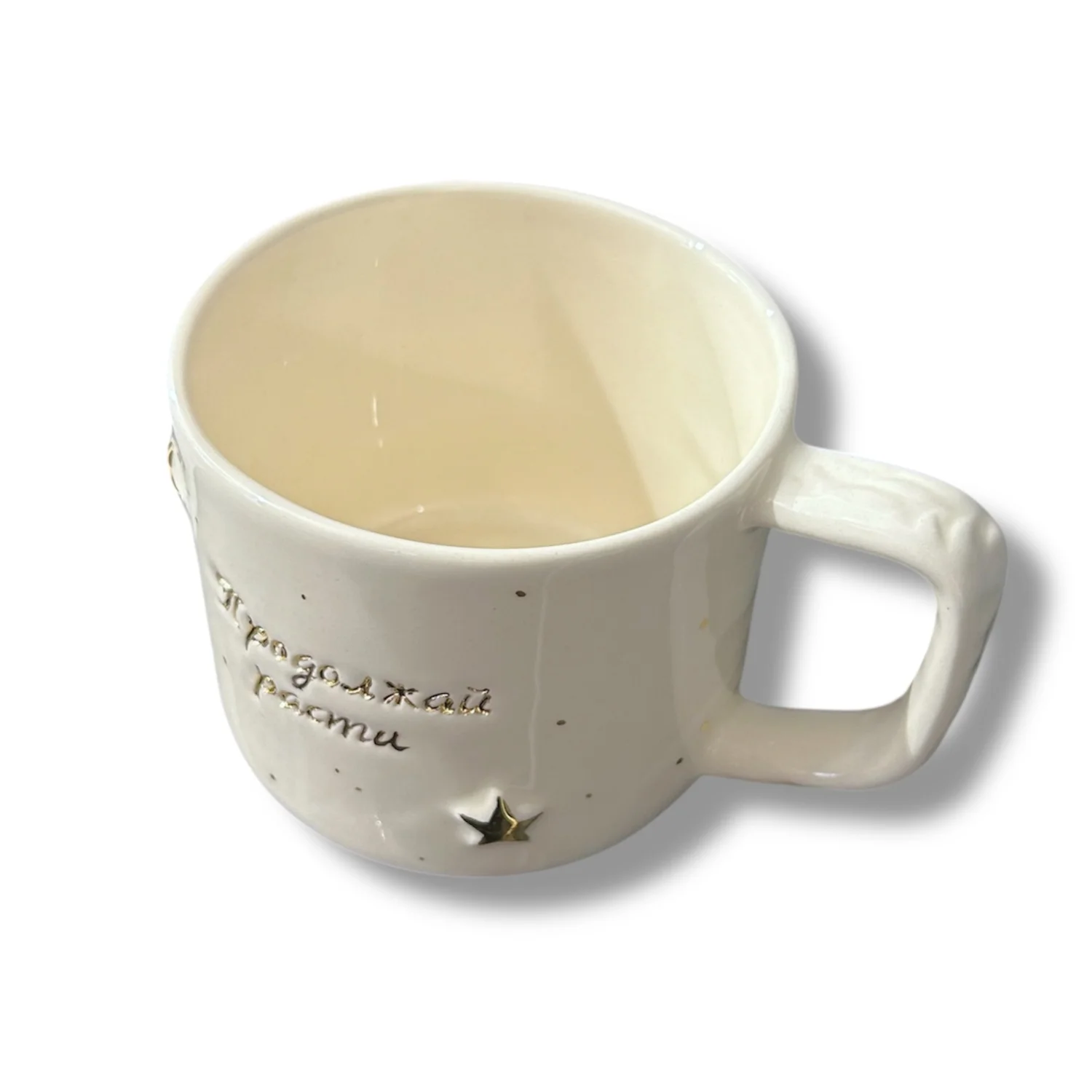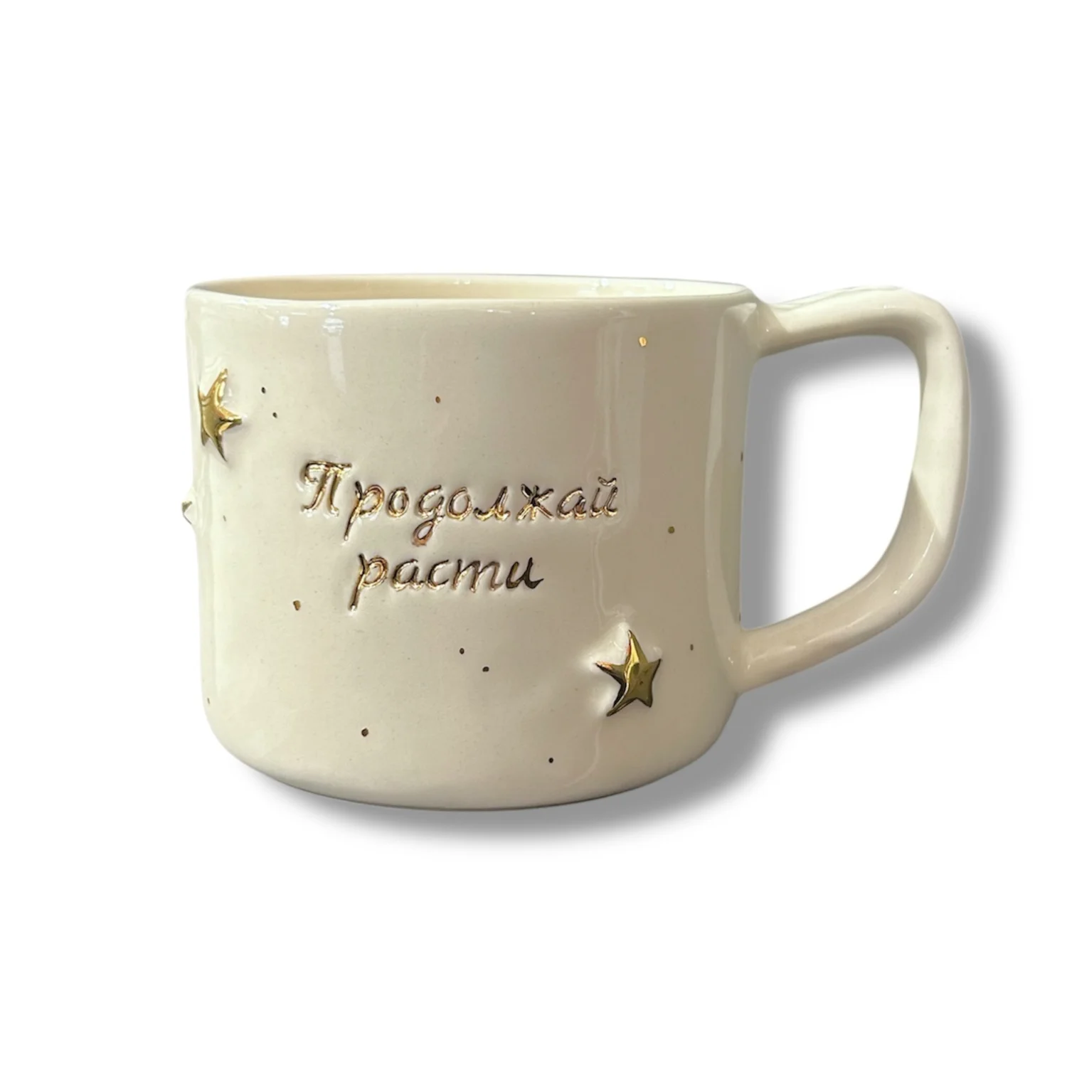 Кружка ручной работы Анна Герман с объёмными золотыми звёздочками и надписью "Продолжай расти", белая, фарфор, 300 мл