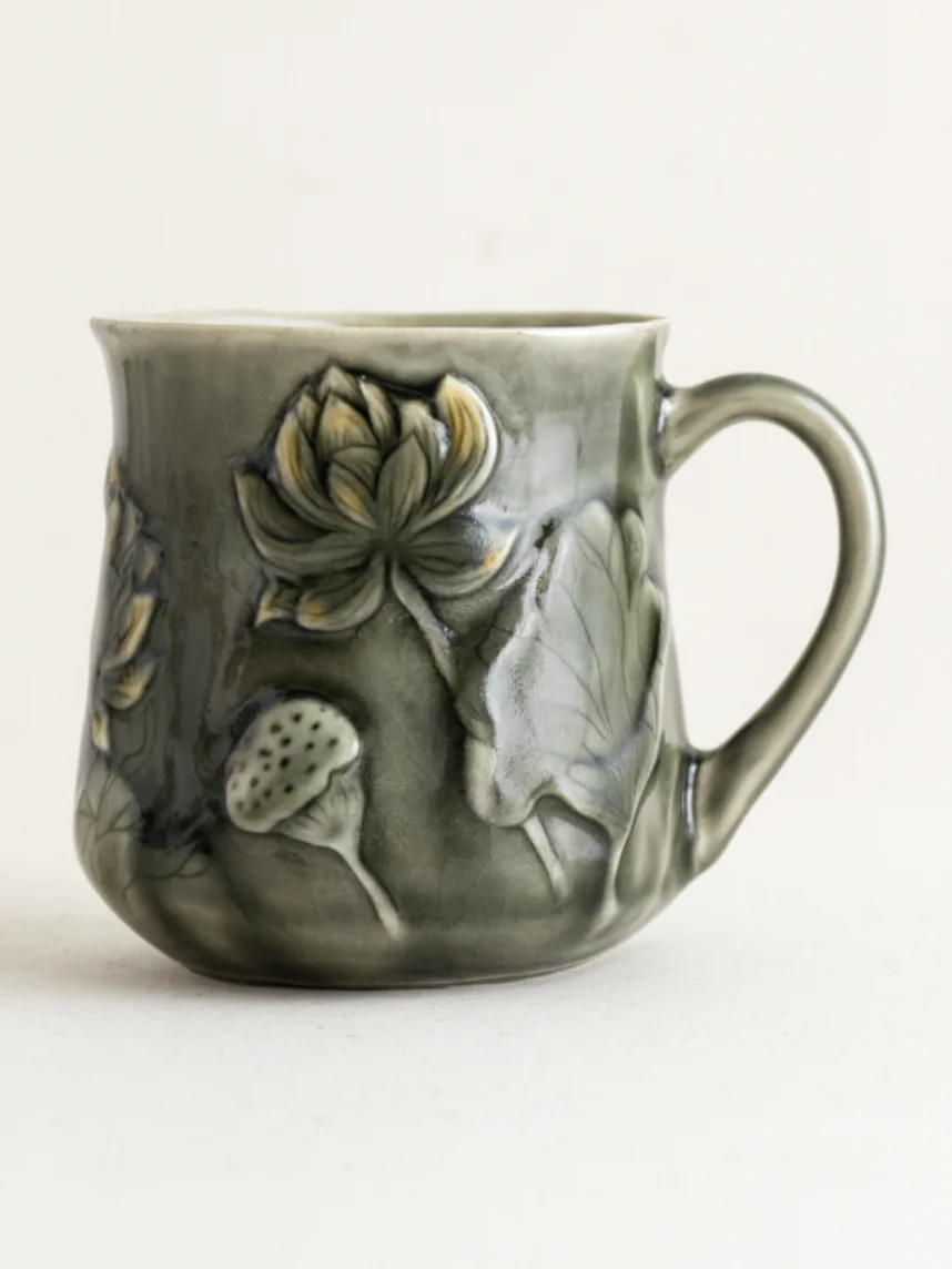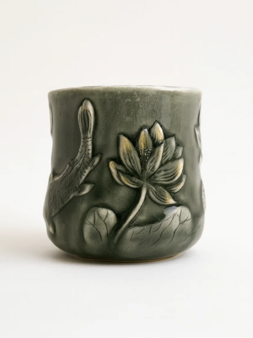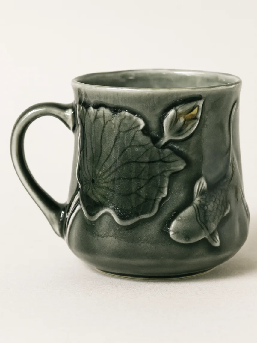 Кружка ручной работы Керамика Александры Пылиной с позолотой «Лотос и карп», черная, фарфор, 430 мл