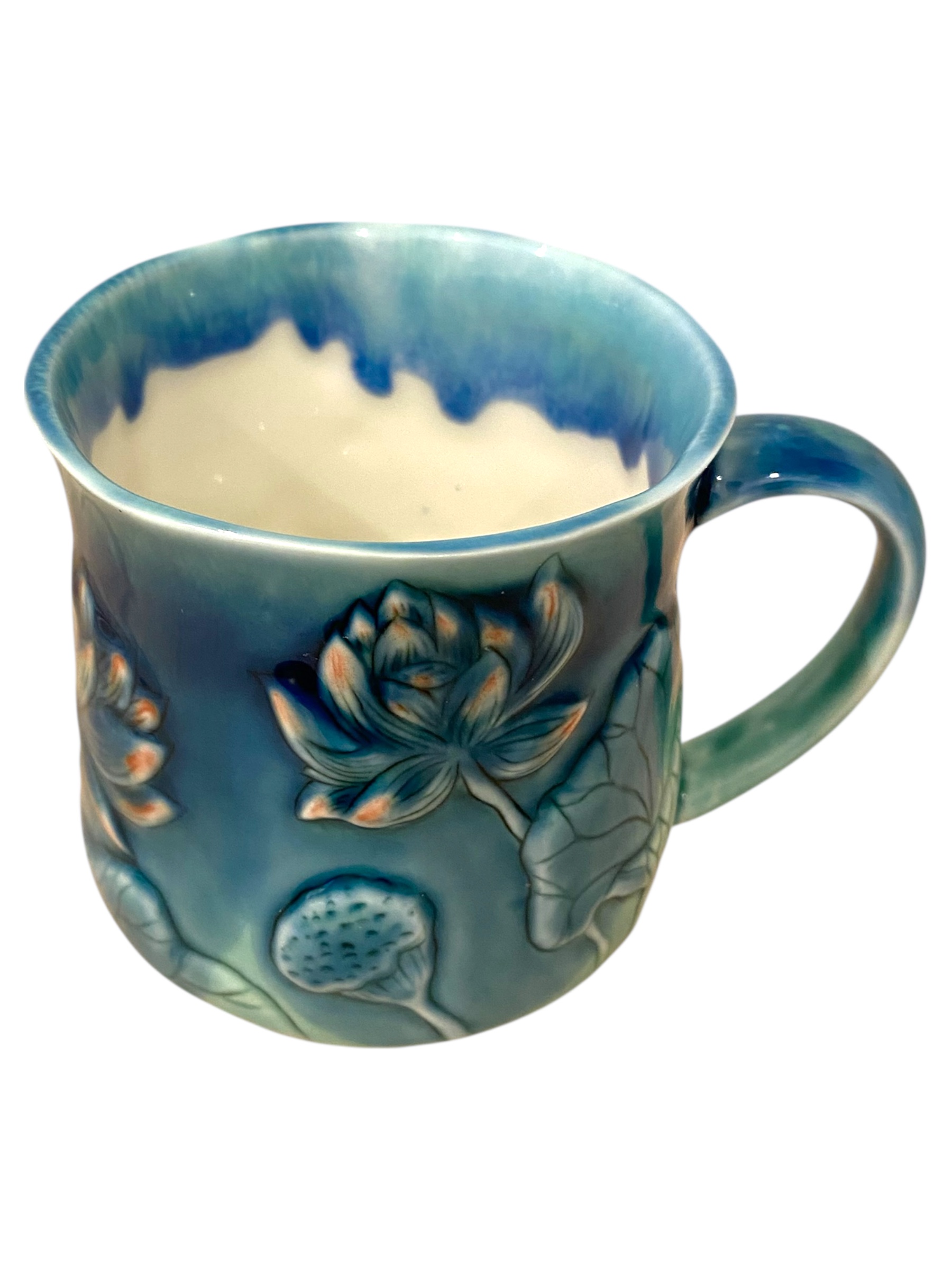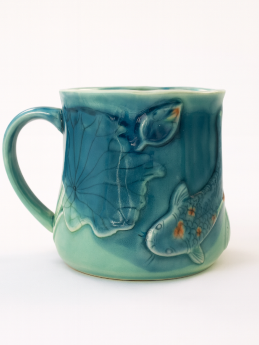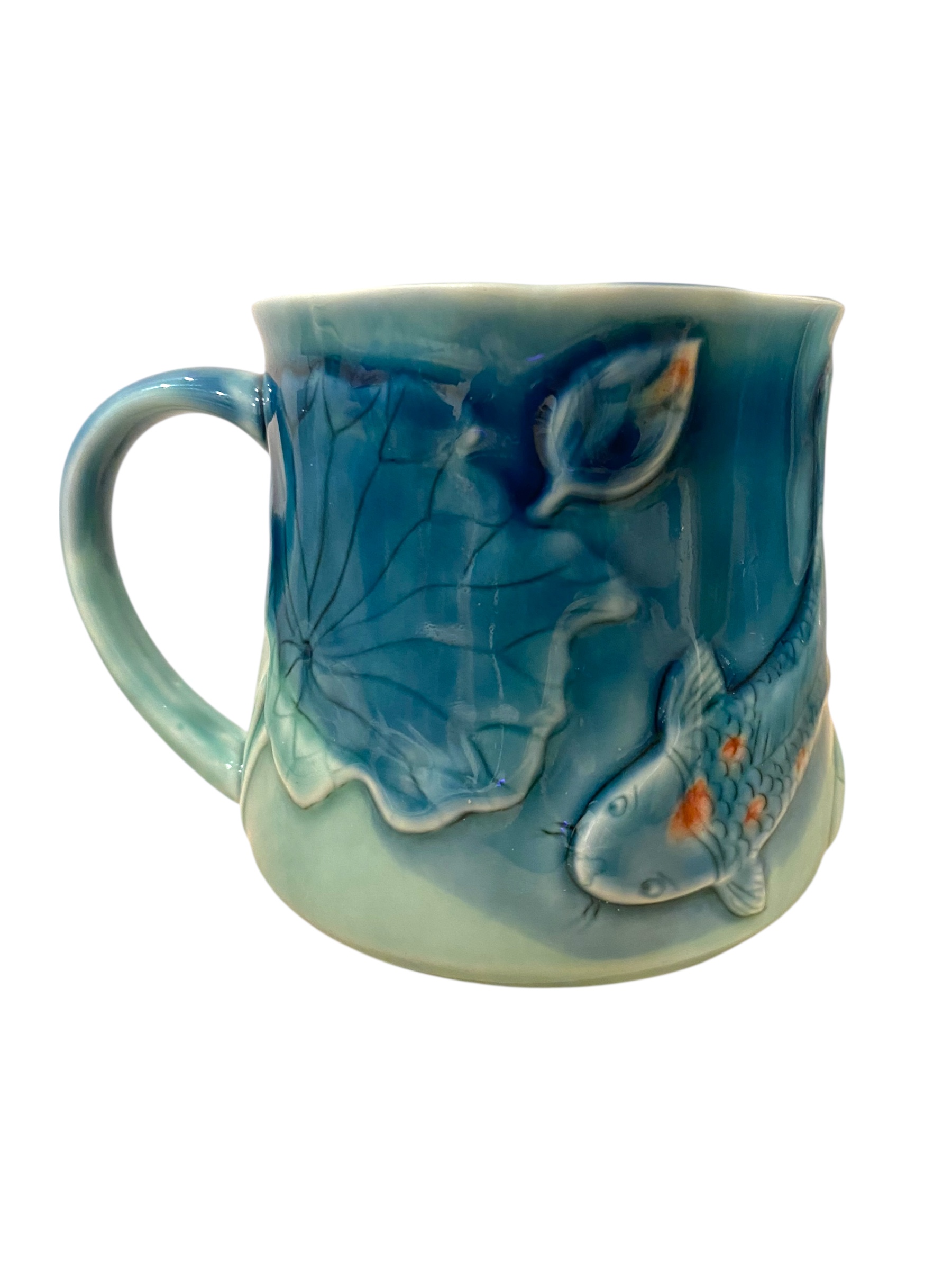 Кружка ручной работы с позолотой «Лотос и карп», синяя, фарфор, 430 мл
