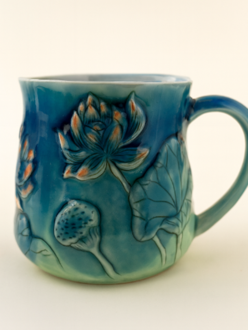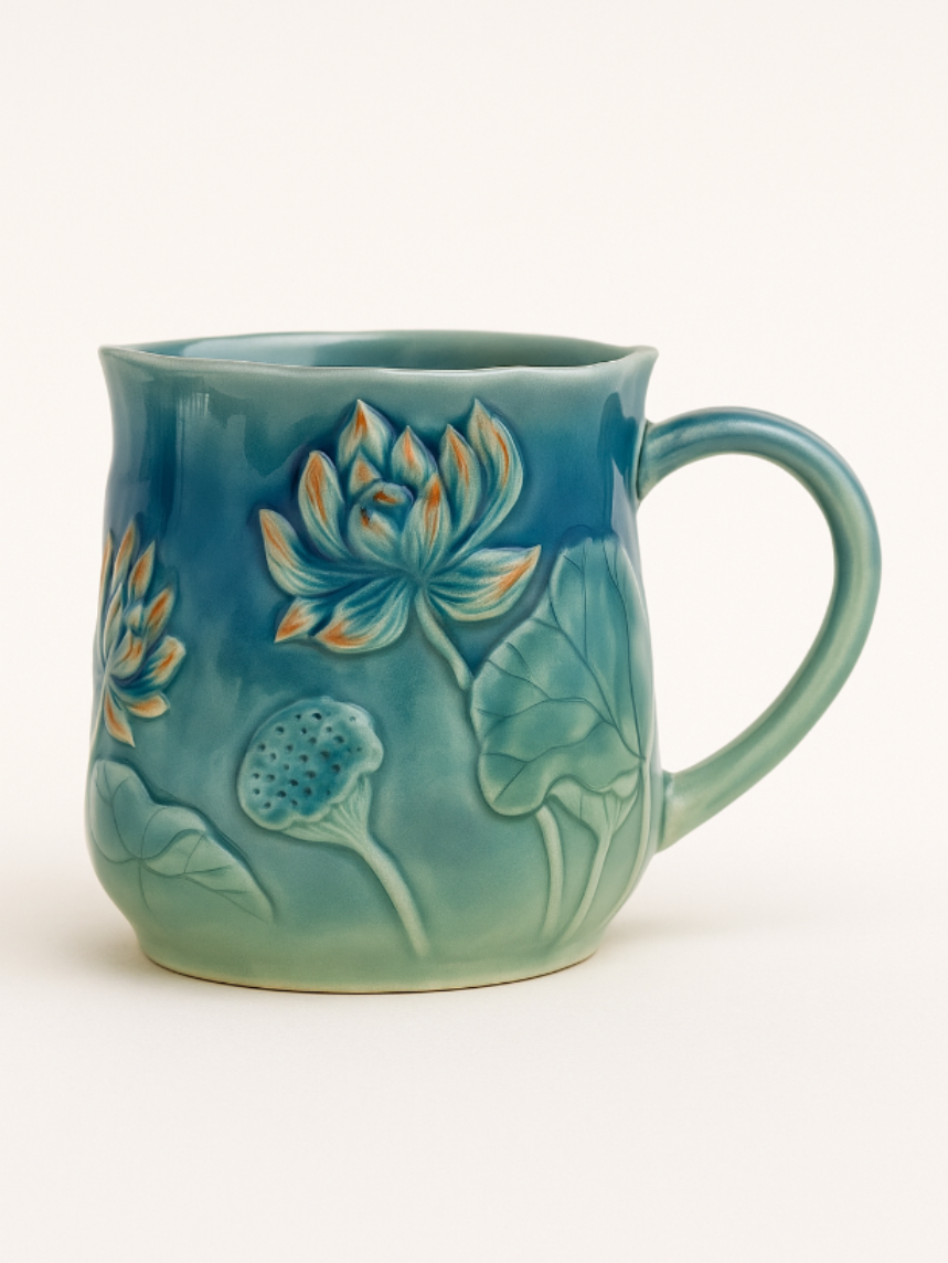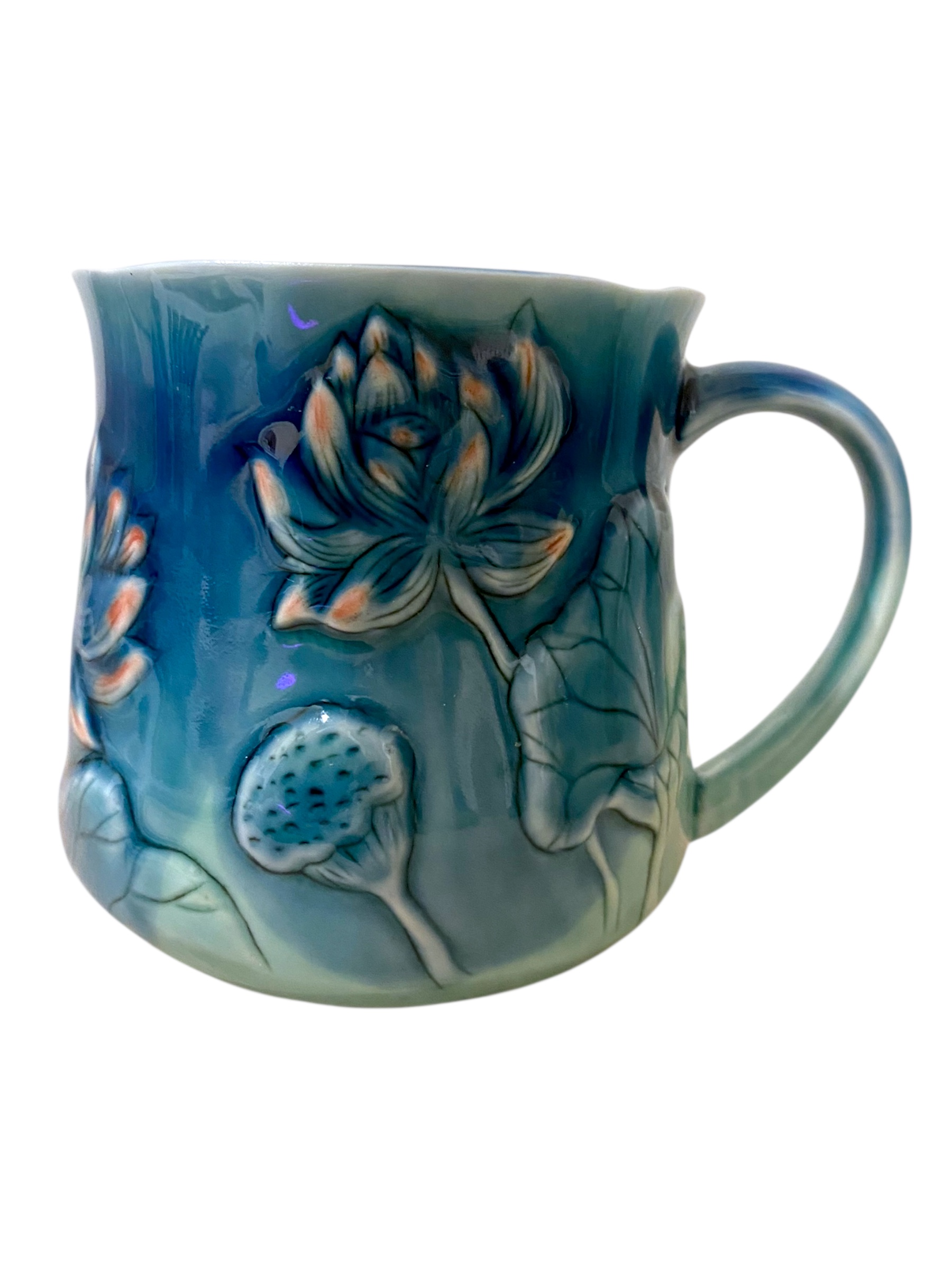 Кружка ручной работы с позолотой «Лотос и карп», синяя, фарфор, 430 мл