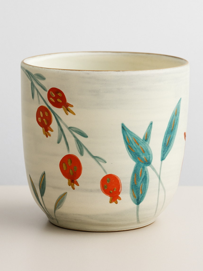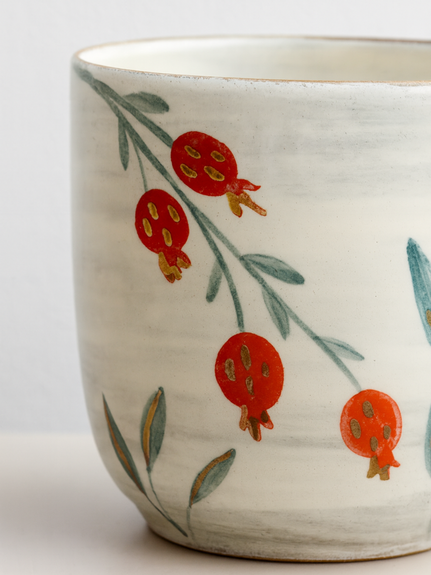 Подглазурная роспись, обжиг на 1220°С. Можно использовать в посудомоечной машине и микроволновке.