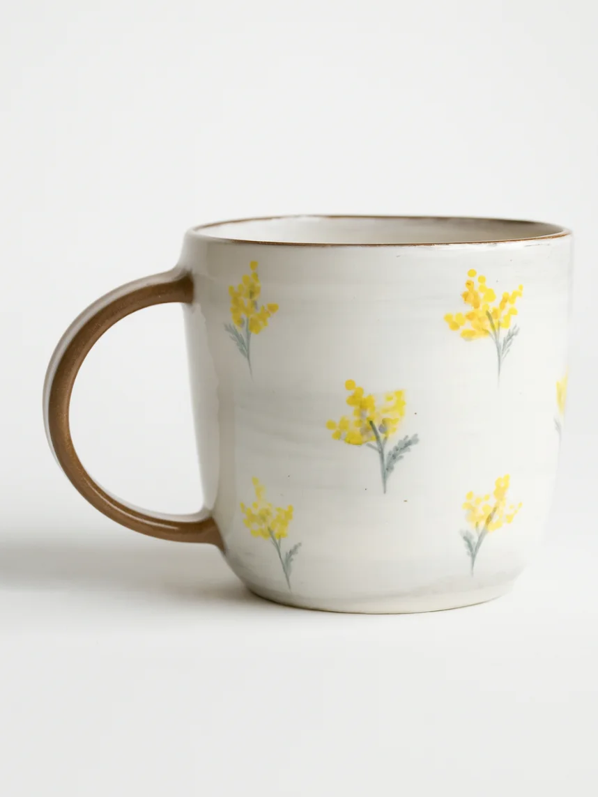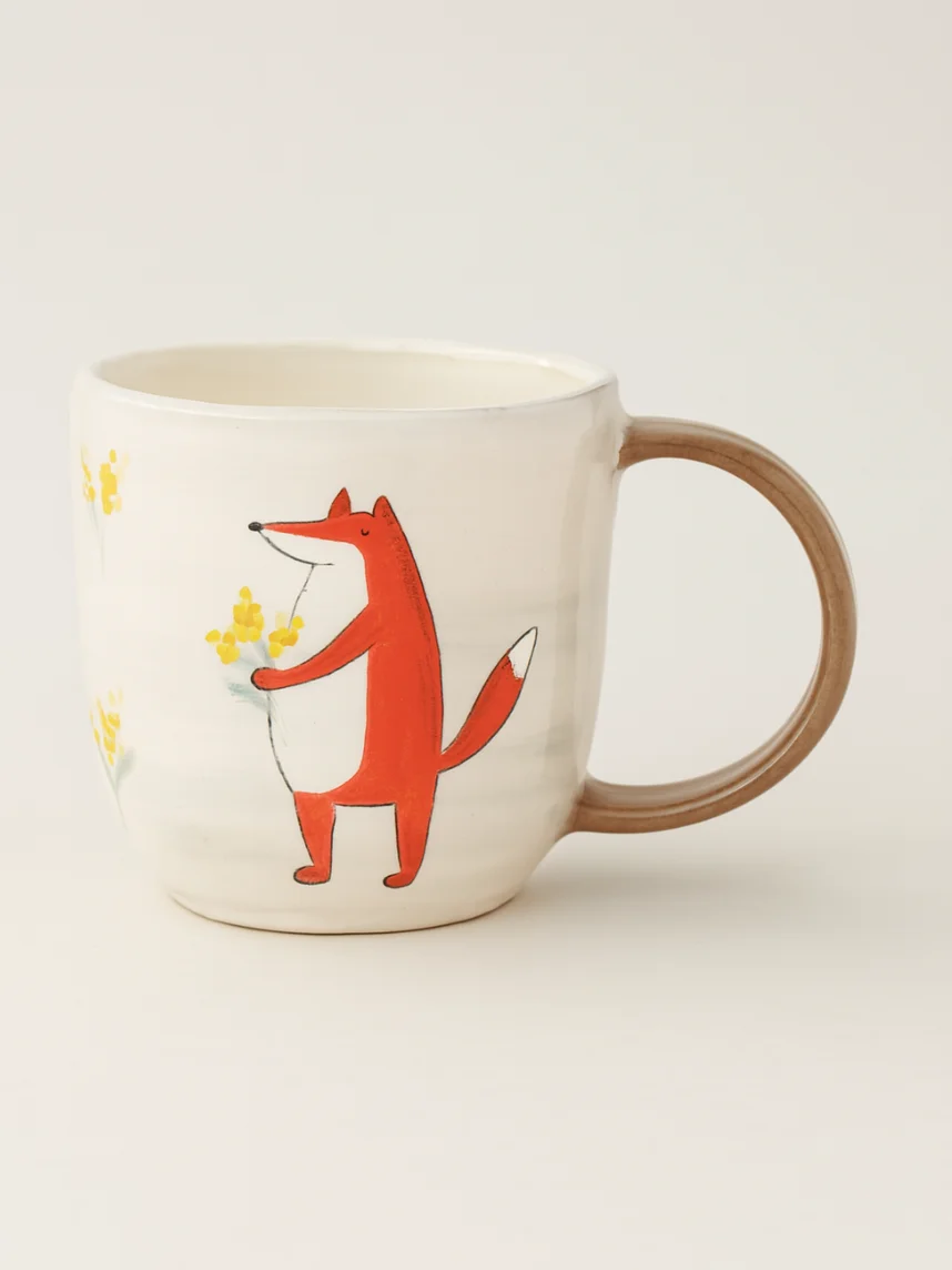 Керамическая кружка ручной работы с росписью «Лис с мимозой». Производитель - керамистка Ситникова Юлия (Kim ceramics).