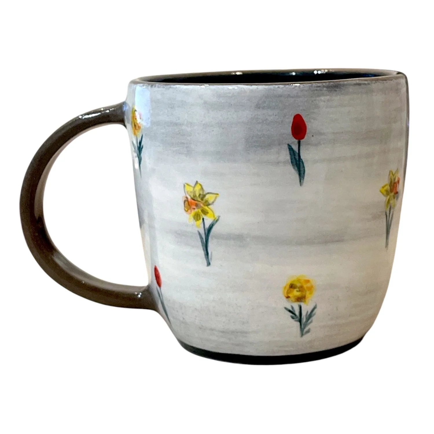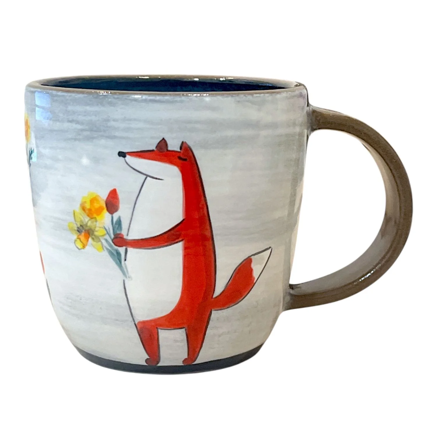 Керамическая кружка ручной работы с росписью «Лис с нарциссами и тюльпанами». Производитель - керамистка Ситникова Юлия (Kim.ceramics).