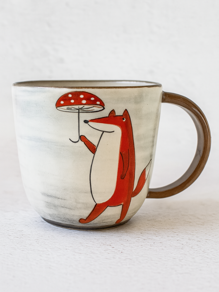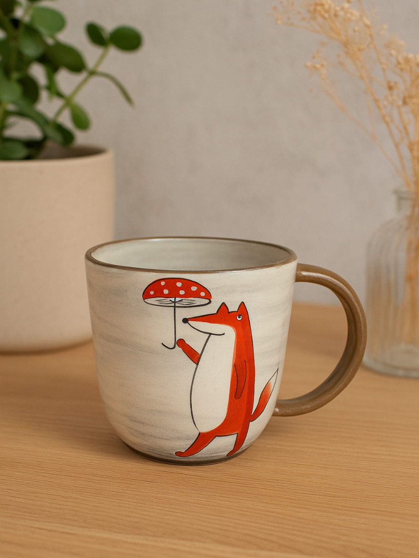 Кружка ручной работы с росписью Лис с зонтиком-мухомором, керамика, 450 мл