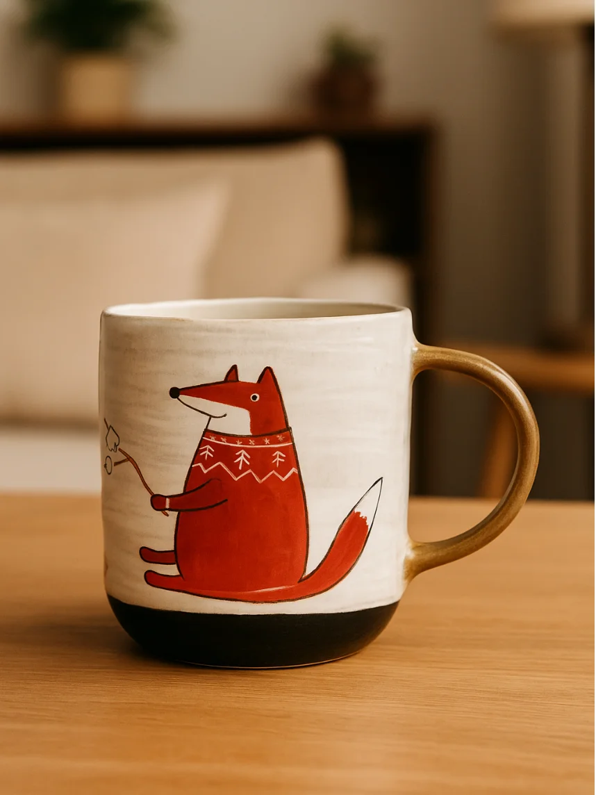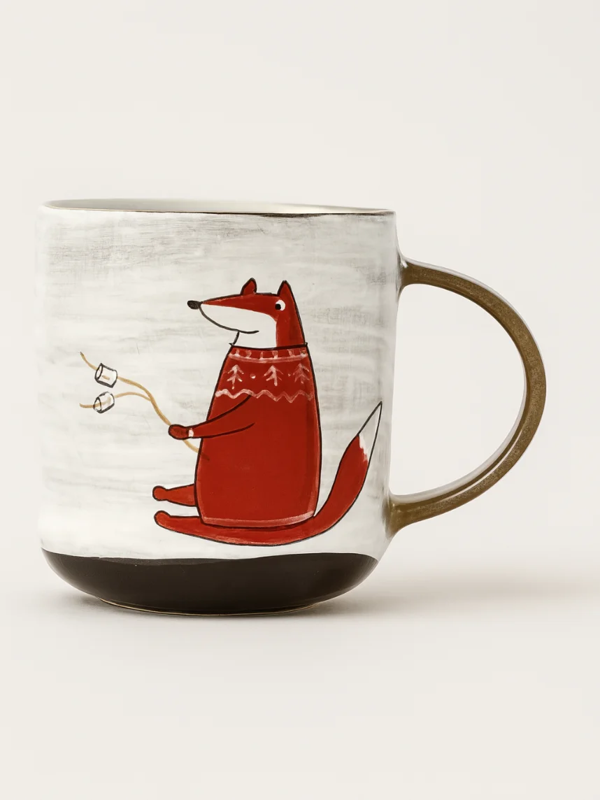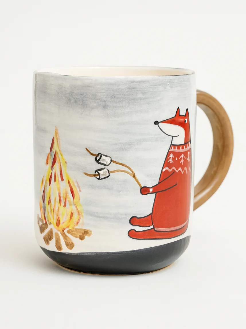 Кружка ручной работы Ким керамика с росписью Лис у костра, 450 мл., белая
