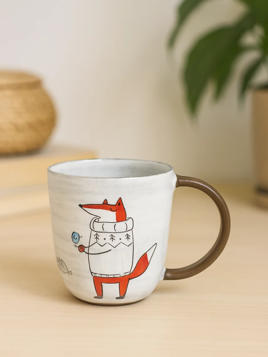Кружка ручной работы Ким керамика с росписью Лис в свитере и птичка, керамика, 450 мл