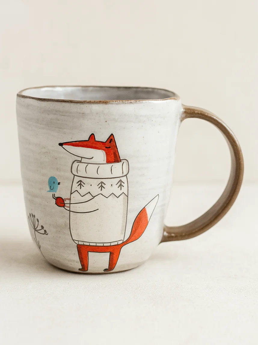 Керамическая кружка ручной работы с росписью «Лис в свитере и птичка». Производитель - керамистка Ситникова Юлия (Kim ceramics).
