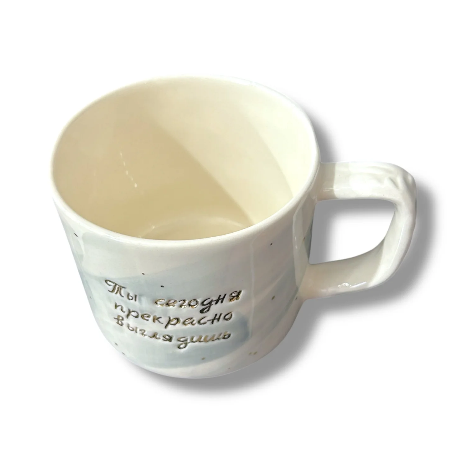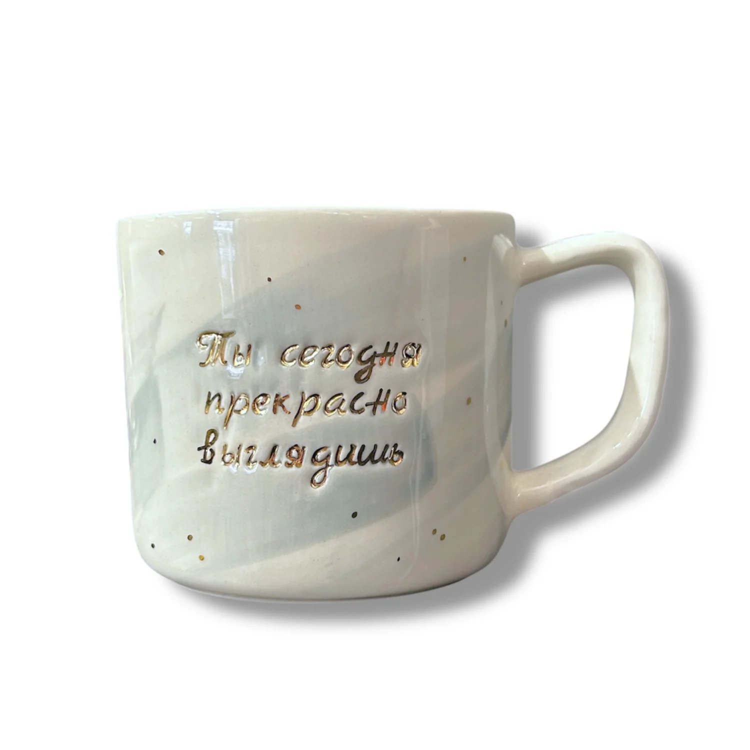 Элегантная серо-белая фарфоровая кружка с надписью «Ты сегодня прекрасно выглядишь».  Ручная работа от петербургской керамистки Анны Герман.