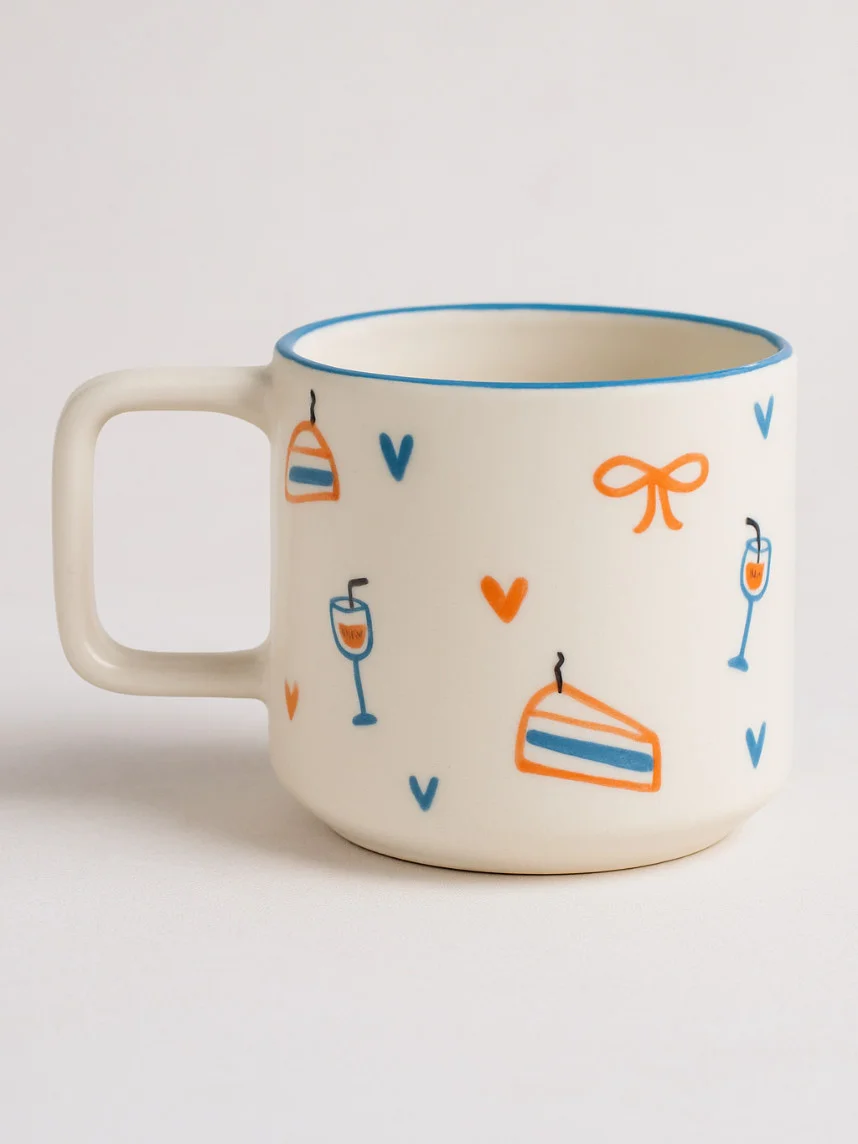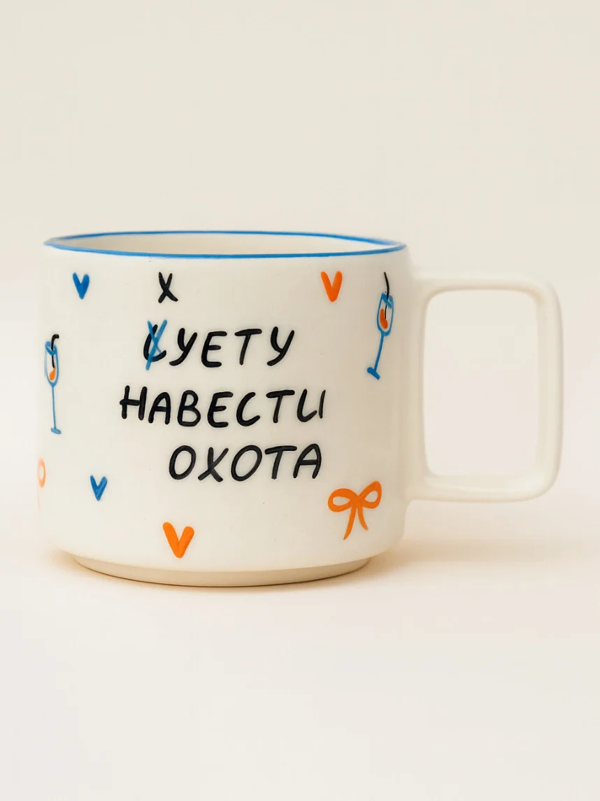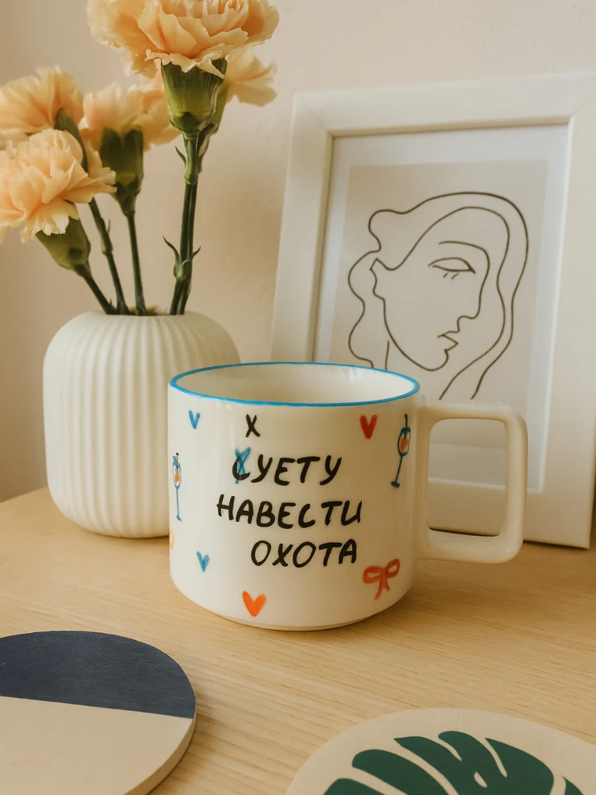 Кружка ручной работы РУКИ В ГЛИНЕ «Суету навести охота», бело-синяя, 350 мл