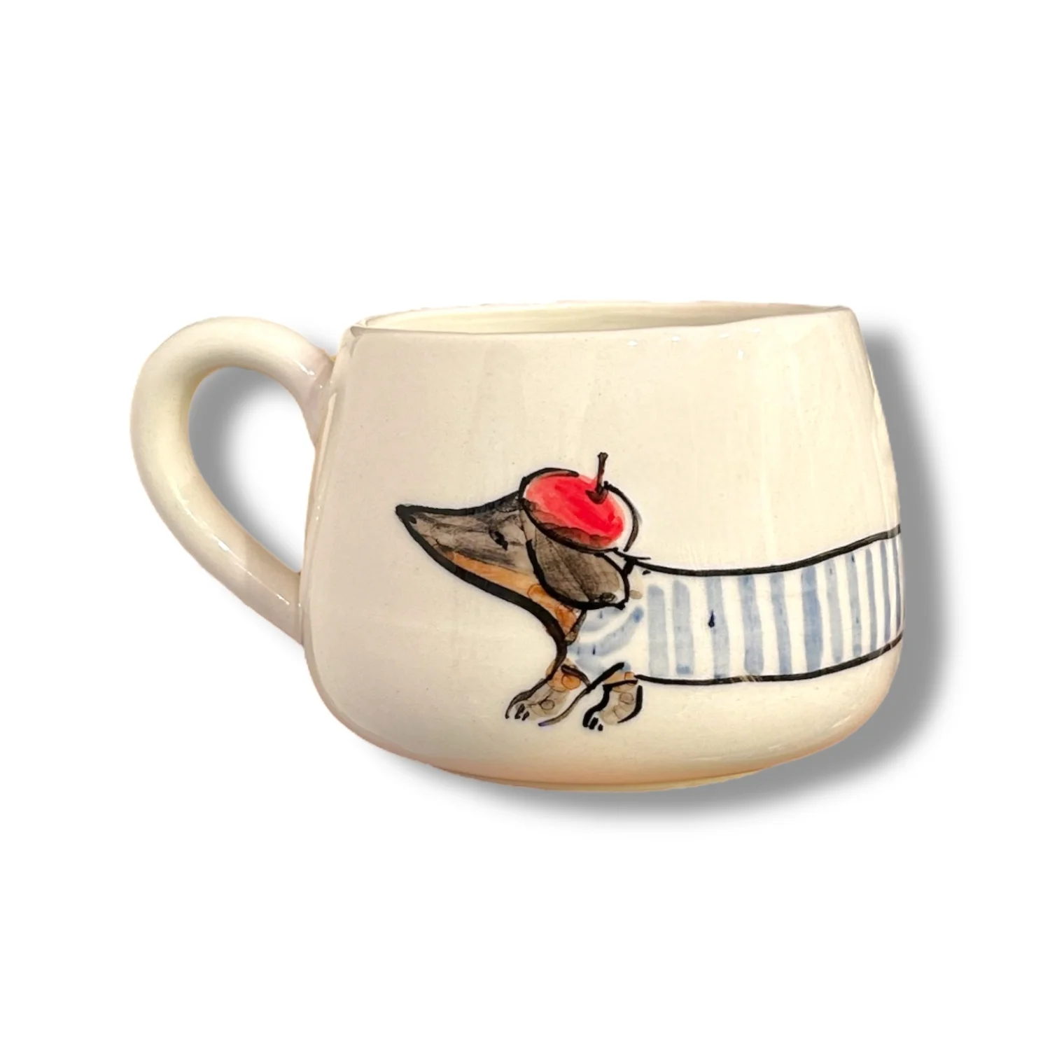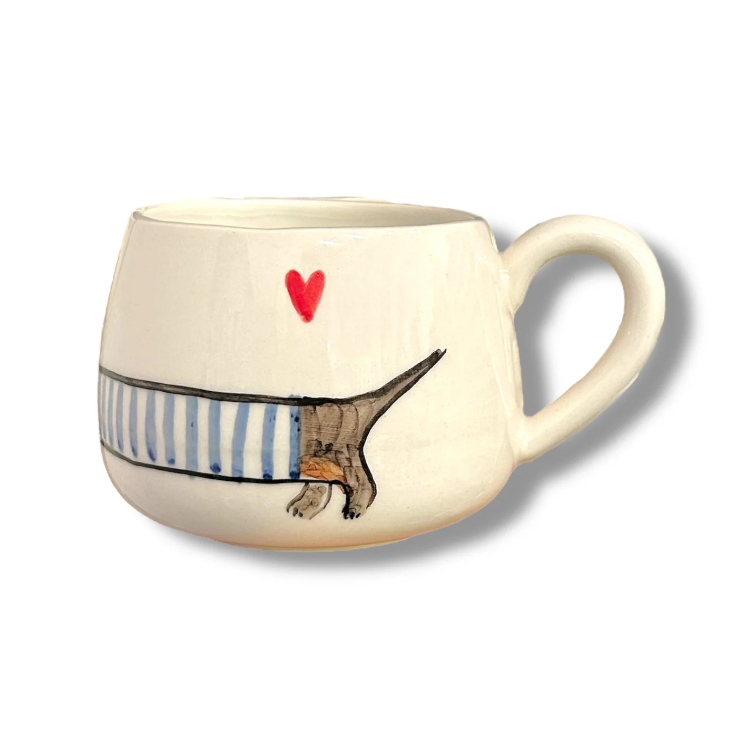 Керамическая кружка ручной работы. Производитель - Nadia Zholobova. Кружка ручной работы выполнена из керамики. Главной особенностью этой кружки является её уникальный дизайн - рисунок таксы, добавляющий ему особого шарма. Такая кружка станет прекрасным дополнением к любому интерьеру и будет радовать своего обладателя не только внешним видом, но и практичностью.