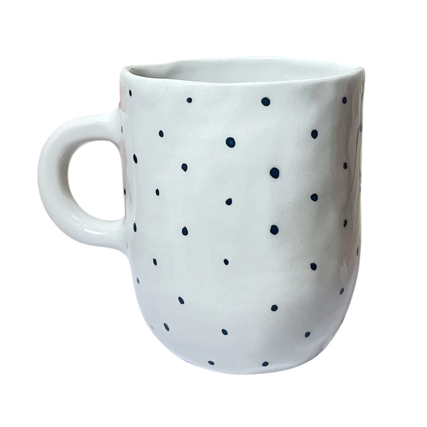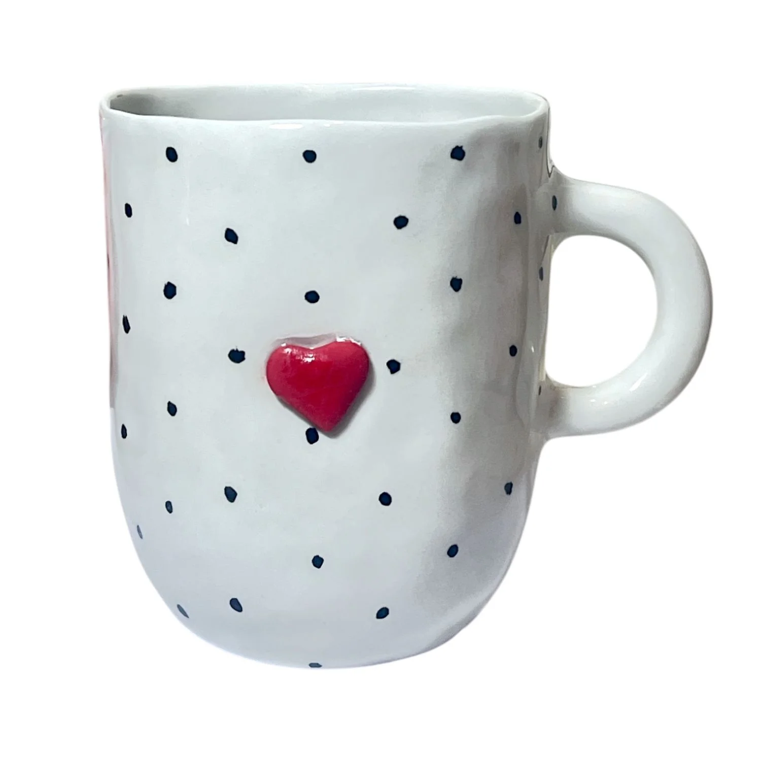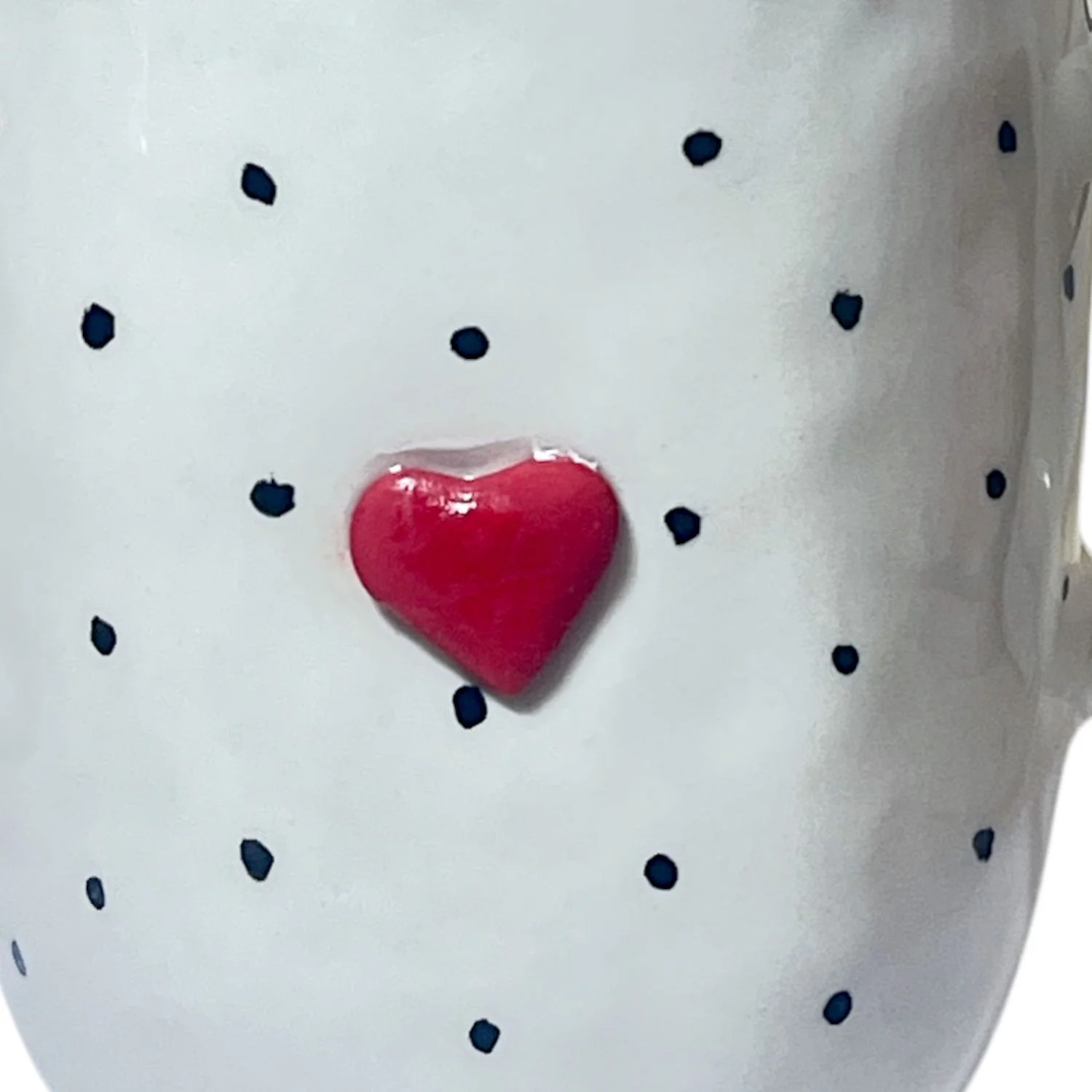 Кружка в чёрную точку с фигуркой сердечка от петербургской мастерской Katyaweber_ceramics - оригинальный подарок для ценителя необычной домашней утвари.