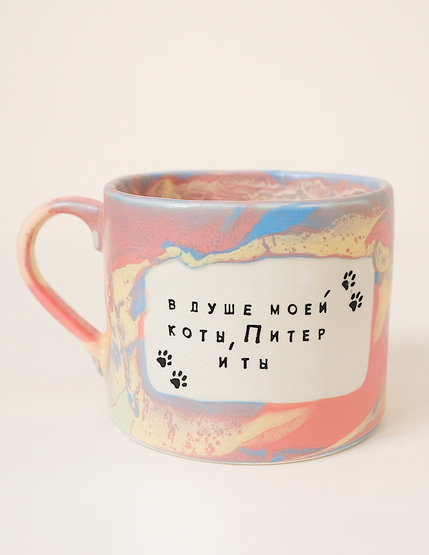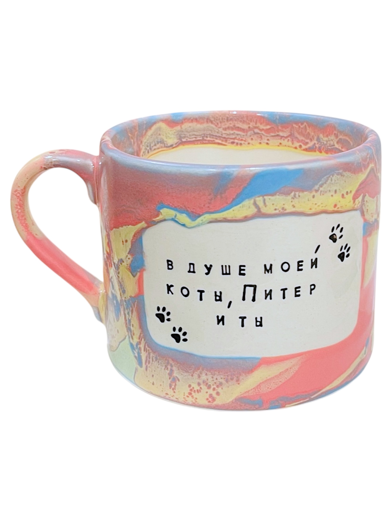 Сувенирная кружка из Санкт-Петербурга от NF ceramics с надписью «В душе моей коты, Питер и ты».