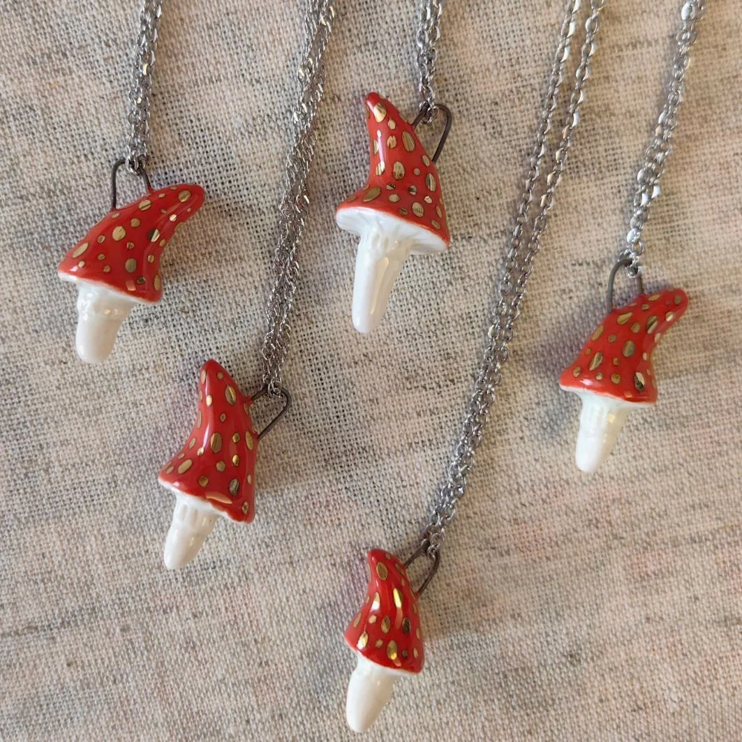 Милый керамический кулон ручной работы «‎Мухоморчик с золотом»‎‎.