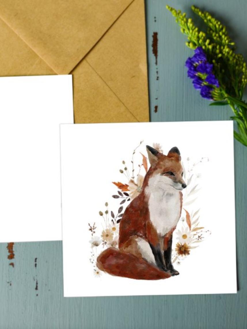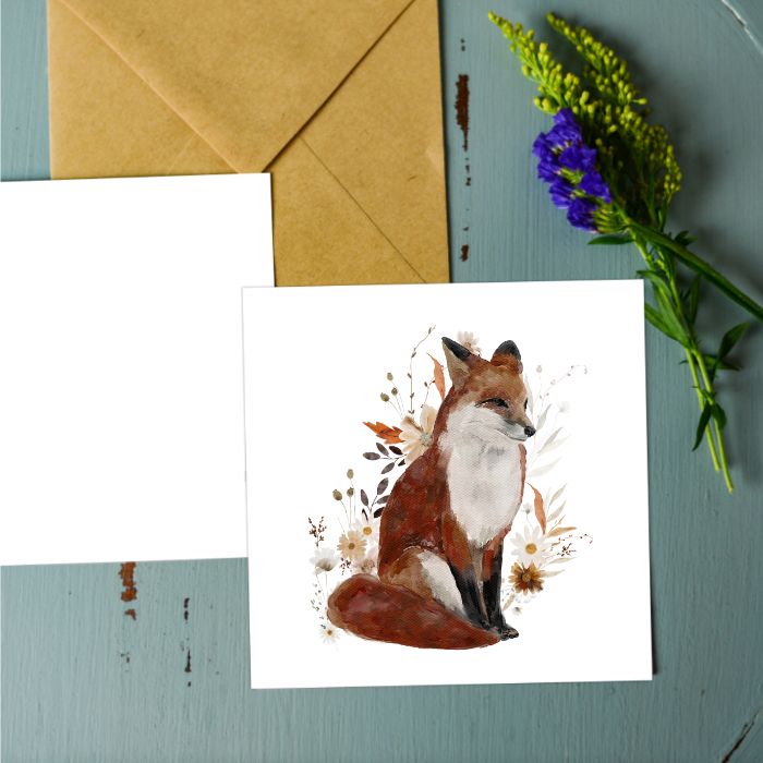 Квадратная открытка с изображением лисы. Цветочный дизайн и свободное место для подписи на обратной стороне делают открытку идеальным дополнением к любому подарку.