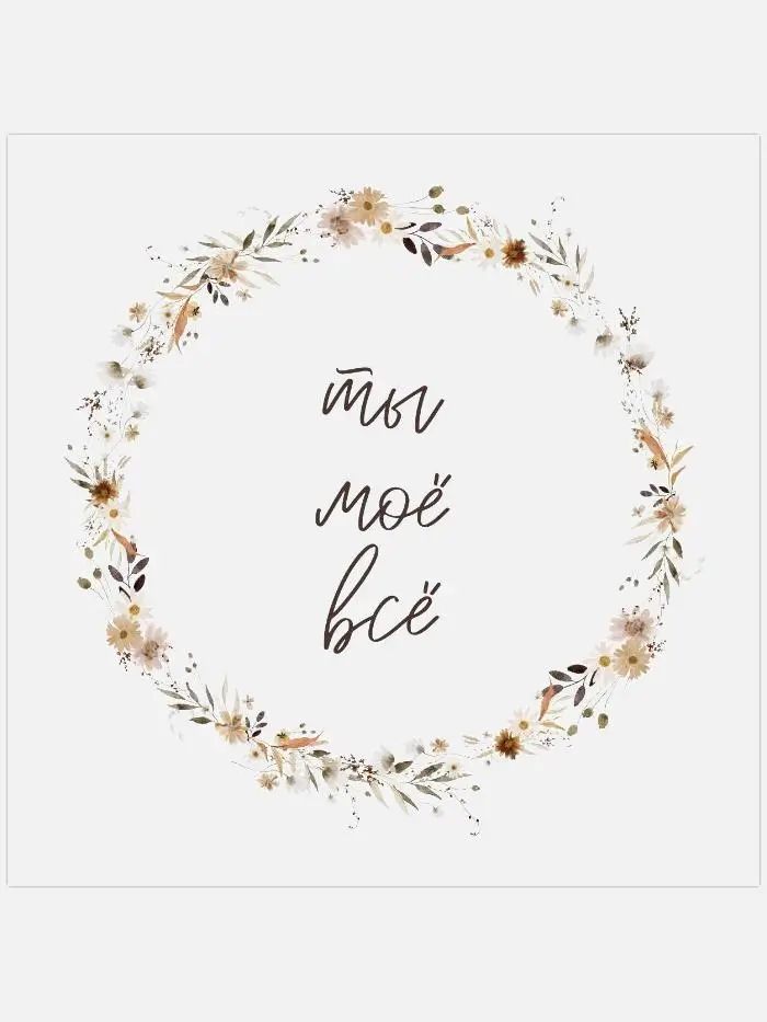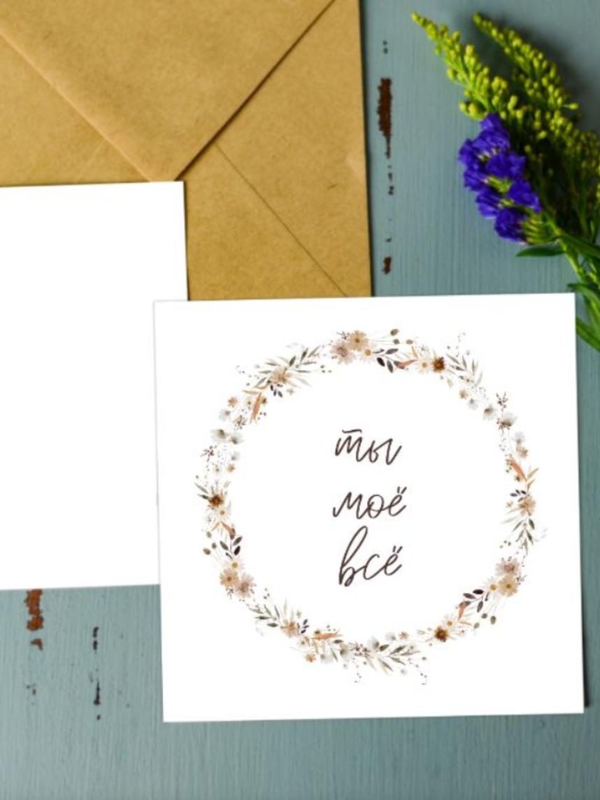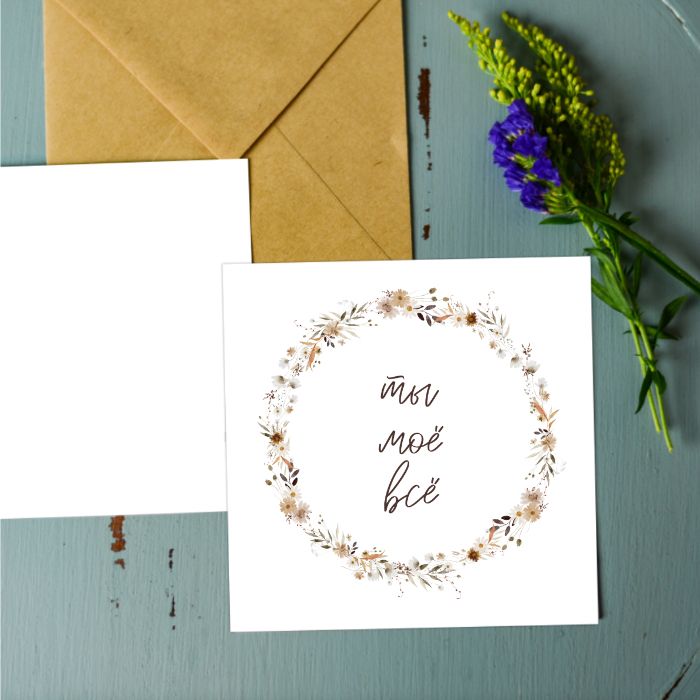 Квадратная открытка с надписью «Ты моё всё». Цветочный дизайн и свободное место для подписи на обратной стороне делают открытку идеальным дополнением к любому подарку.