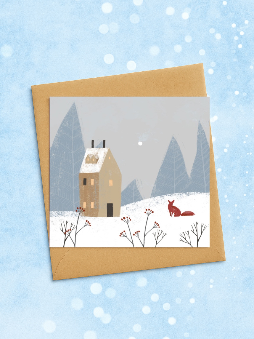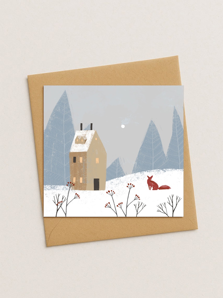 Квадратная зимняя сканди открытка «Домик и лиса»