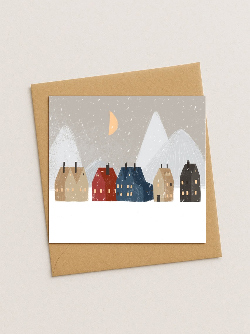 Квадратная зимняя сканди открытка «Домики и горы»