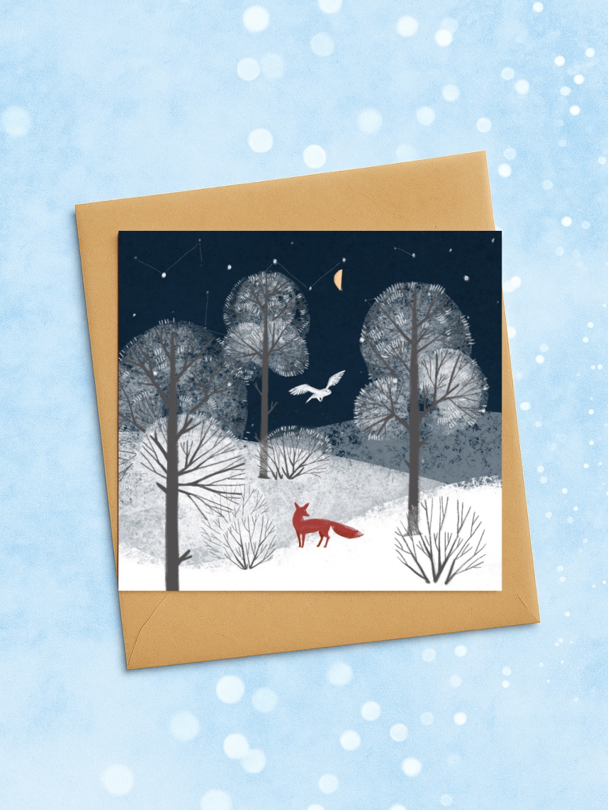 Квадратная зимняя сканди открытка «Лиса в ночном лесу»