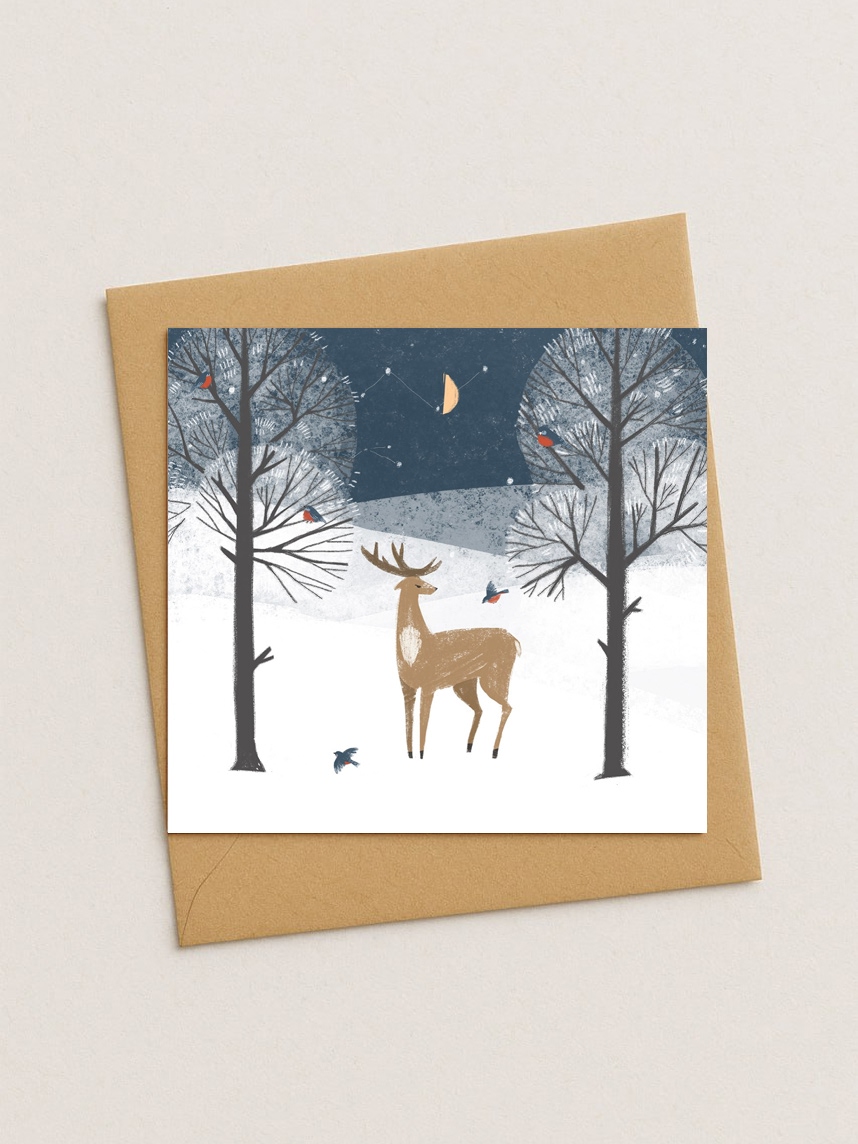 Квадратная зимняя сканди открытка «Олень в ночном лесу»