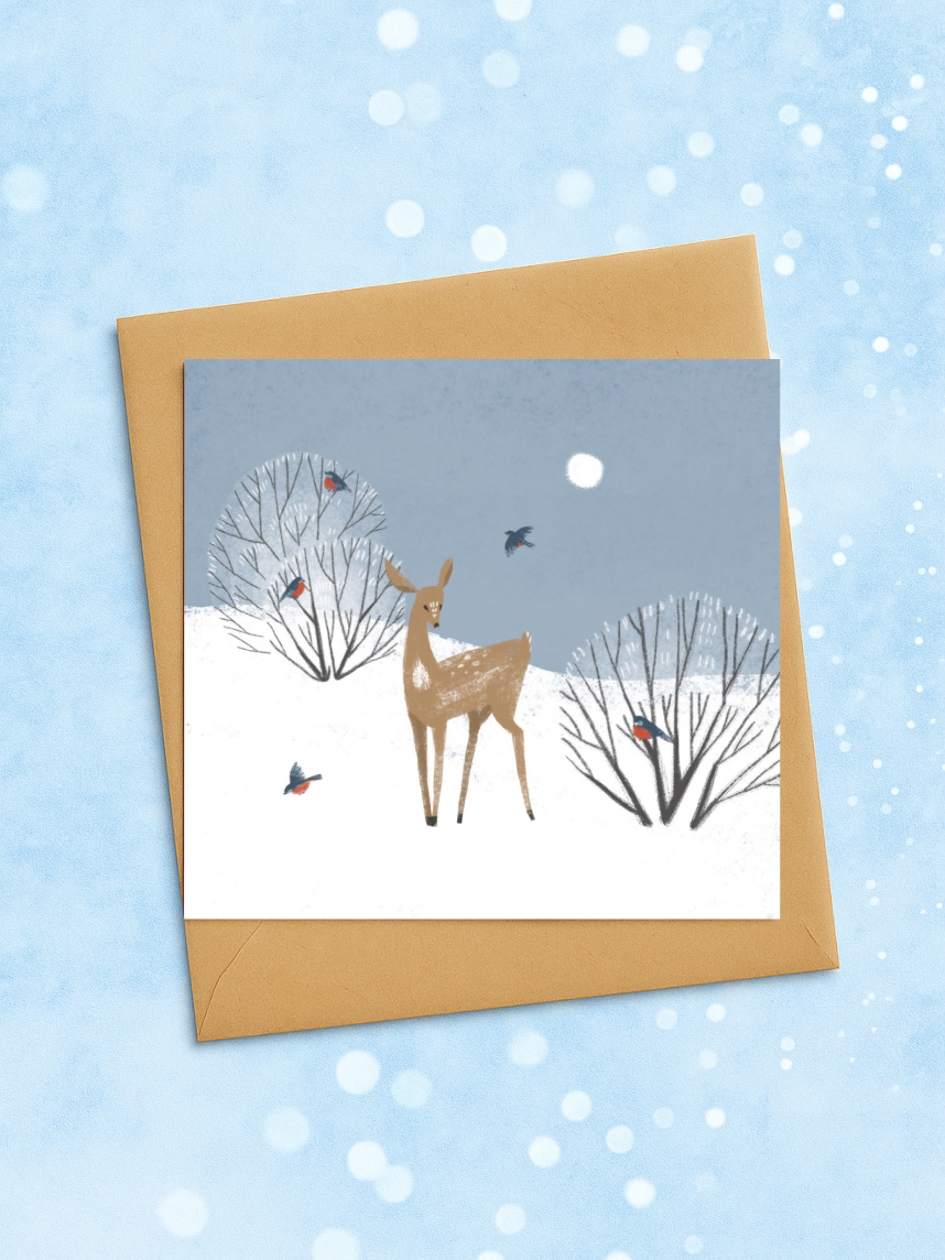 Квадратная зимняя сканди открытка «Олененок и снегири»