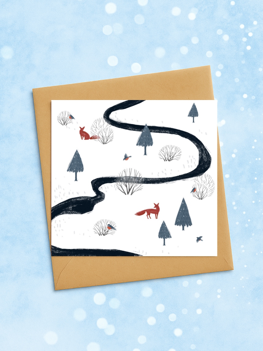 Квадратная зимняя сканди открытка «Пейзаж со зверятами»
