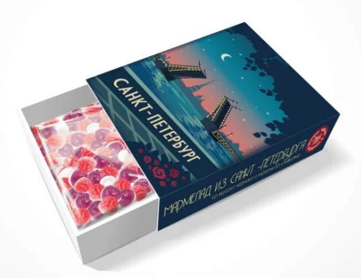 Жевательный мармелад из серии Санкт-Петербург со вкусом черники и малины со сливками - это яркое и вкусное напоминание о поездке в Северную столицу.