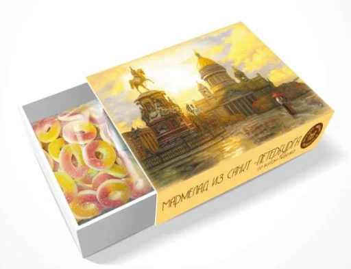Жевательный мармелад из серии Санкт-Петербург со вкусом персика - это яркое и вкусное напоминание о поездке в Северную столицу.