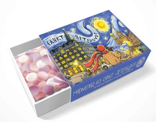 Мармелад упакован в стильную коробочку с высокорельефным УФ лаком.