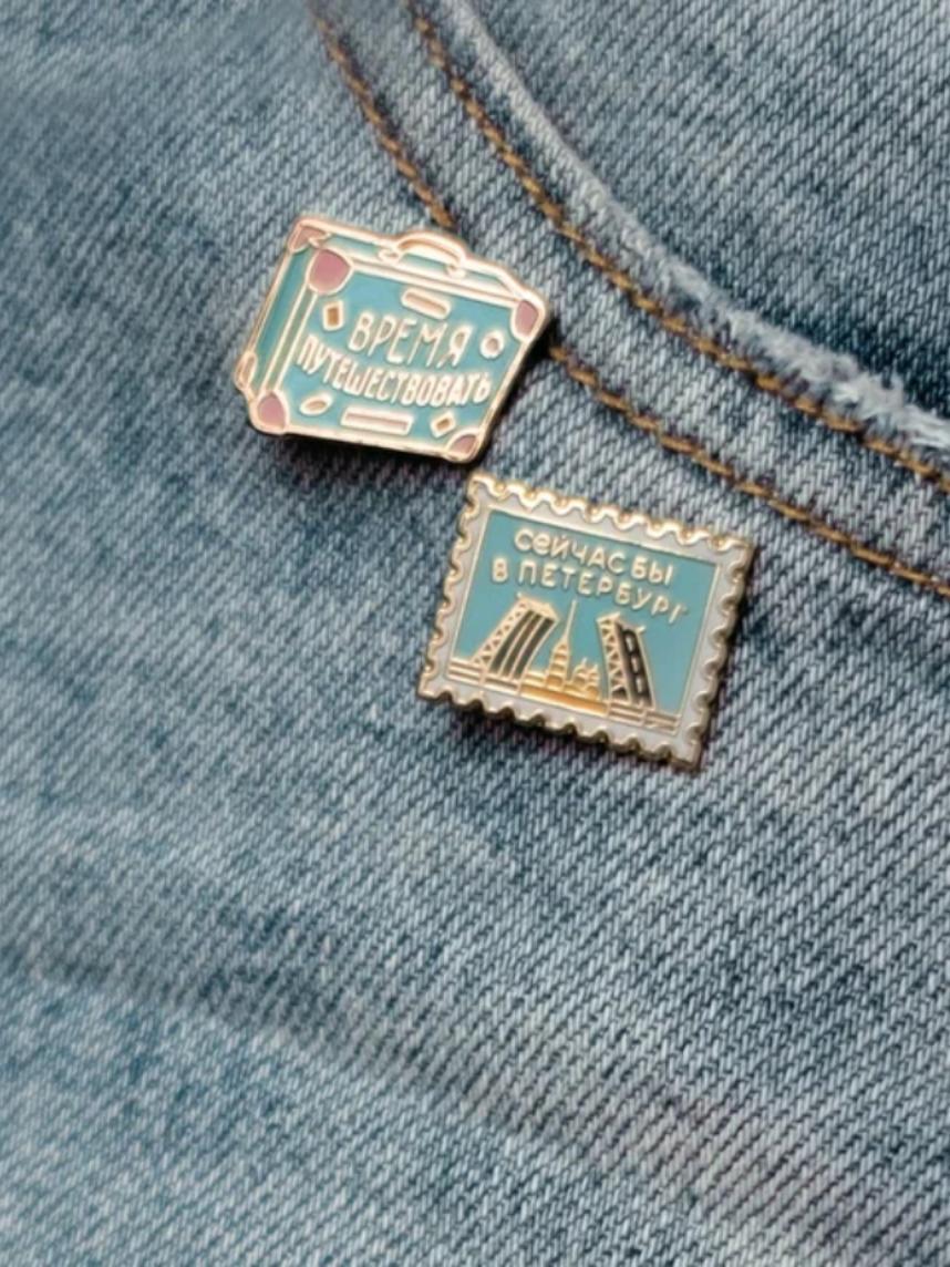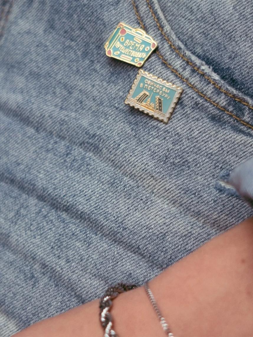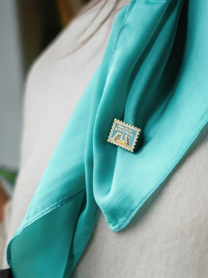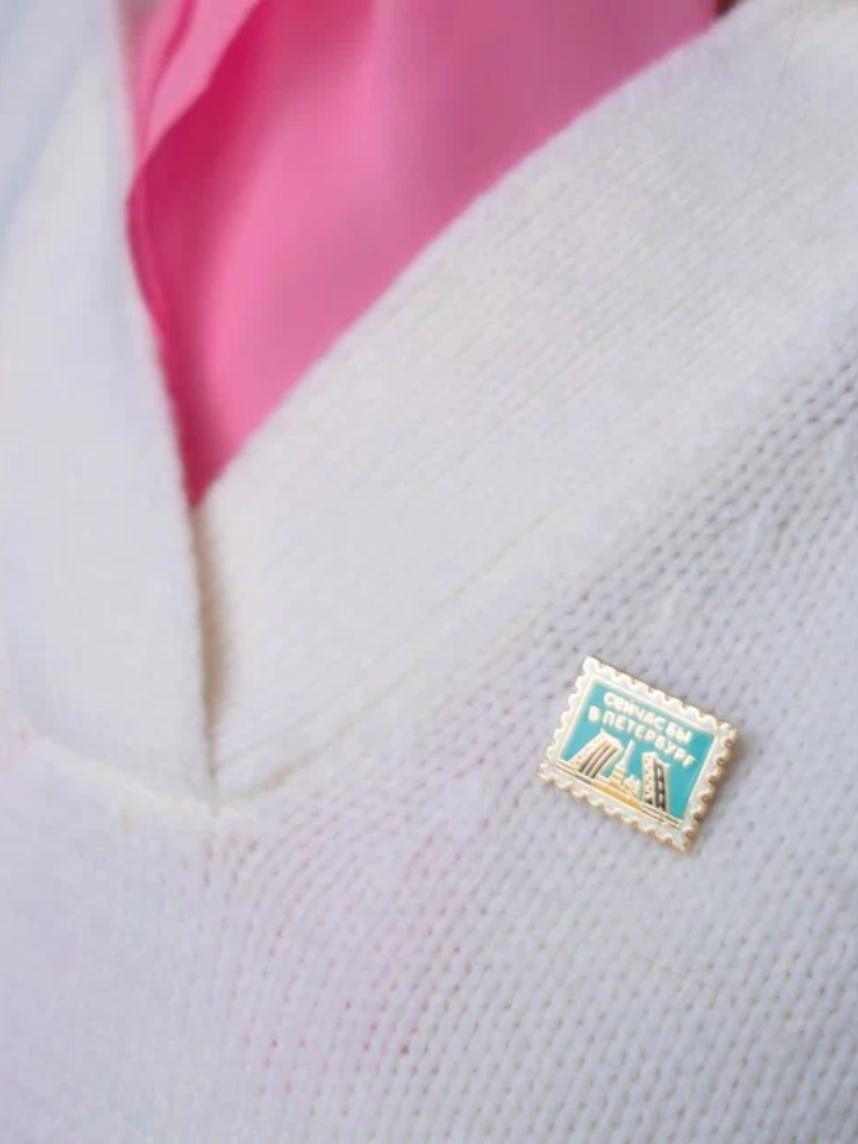 Металлический пин «Сейчас бы в Петербург» — миниатюрная открытка в виде марки для тех, кто оставил сердце на берегах Невы.