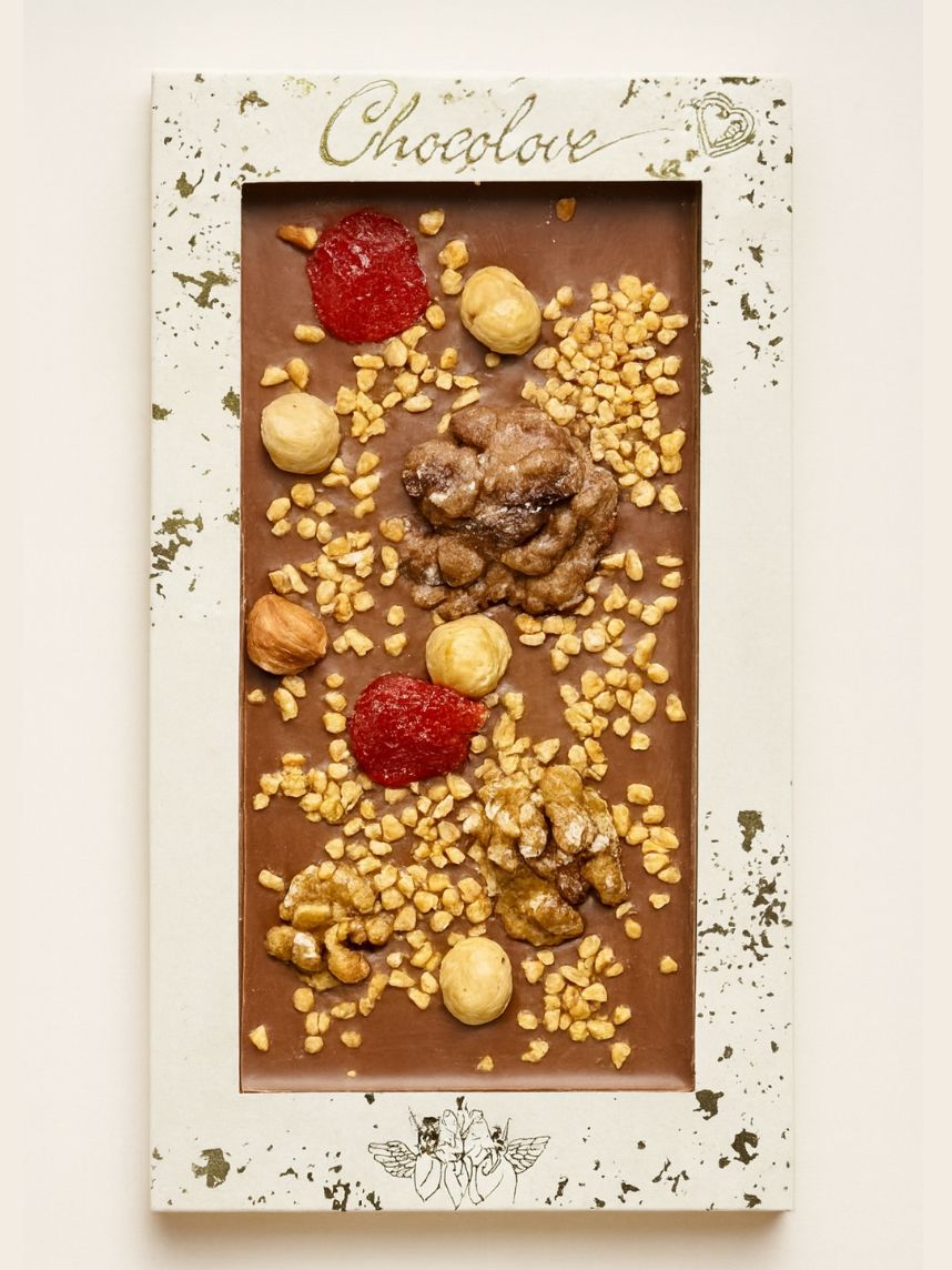 Молочный бельгийский шоколад с грецким орехом, фундуком, вишней и дутым рисом