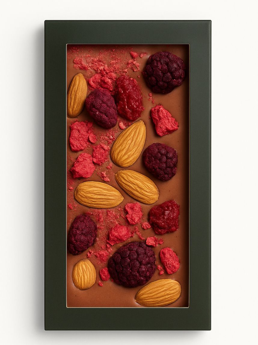 Молочный шоколад ручной работы с ежевикой, вишней, малиной и миндалём, 45 гр