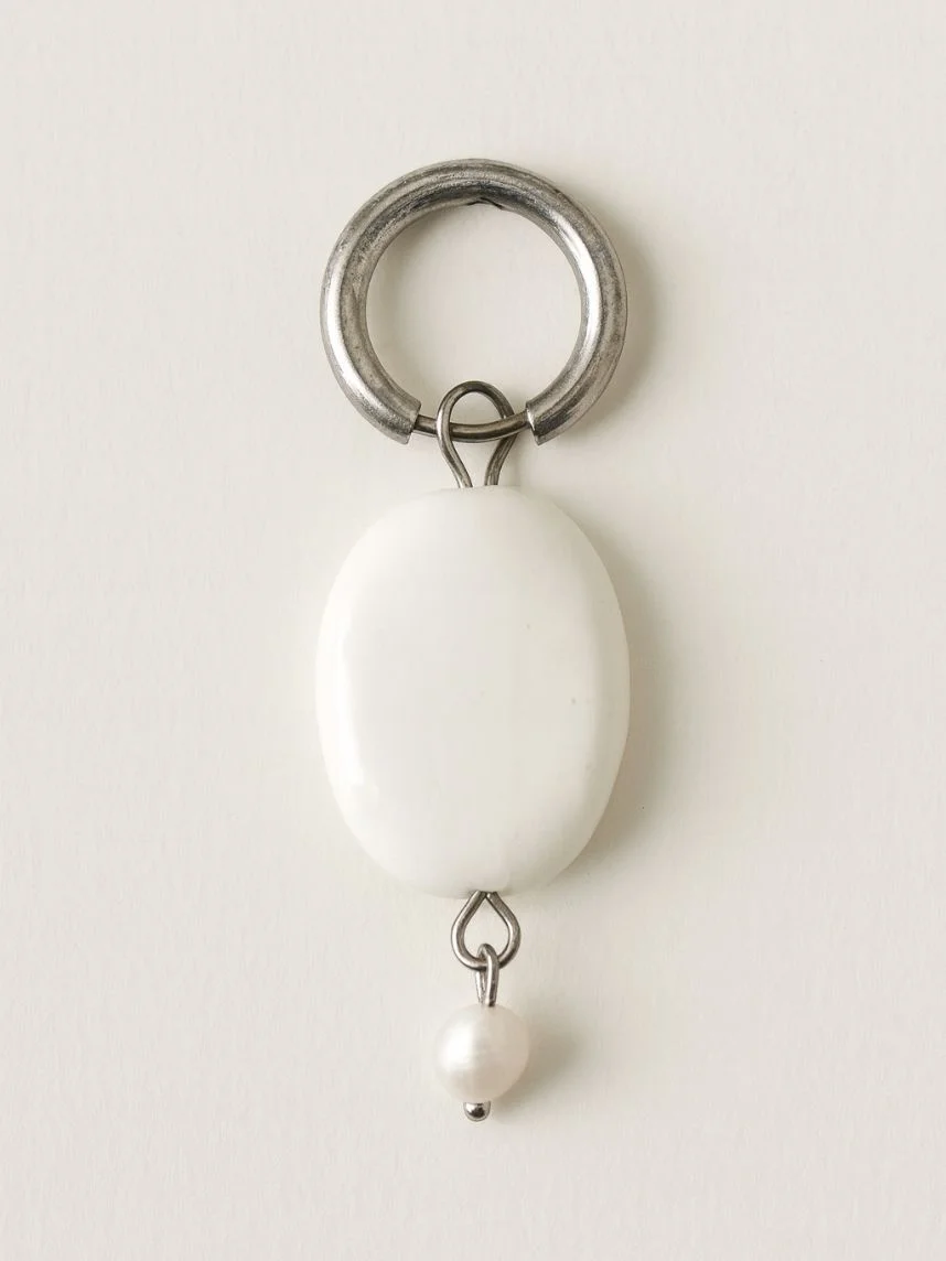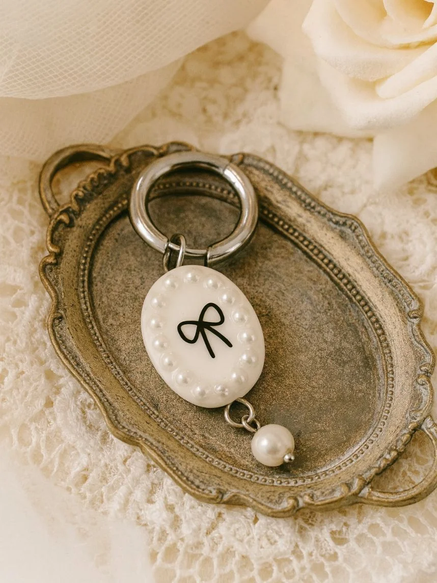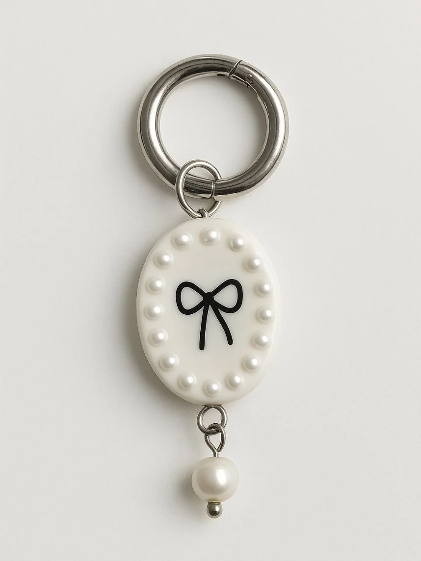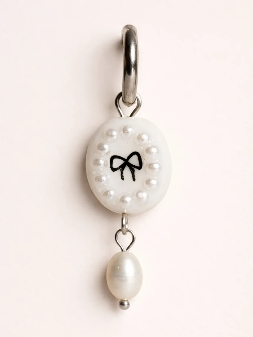 Моносерьга ручной работы овальная «Бантик» с жемчужной подвеской из полимерной глины бренда Pet Polly Pocket.