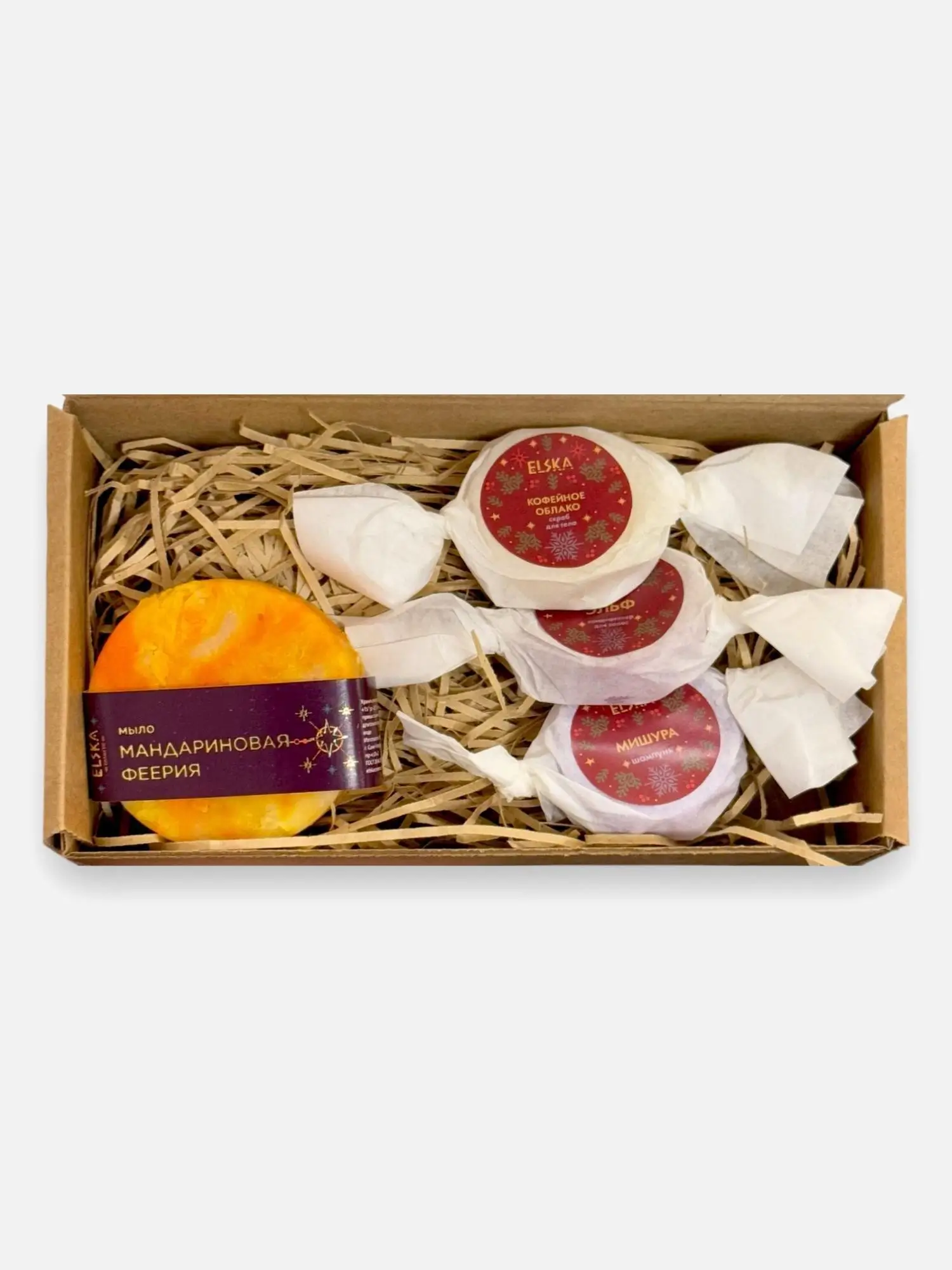 Набор косметики включает в себя мыло "Мандариновая феерия" и 3 мини-версии: кондиционера "Эльф", шампуня "Мишура" и скраба для тела "Кофейное облако" в подарочной эко-упаковке от бренда натуральной косметики Elska. Станет замечательным подарком на Новый год.