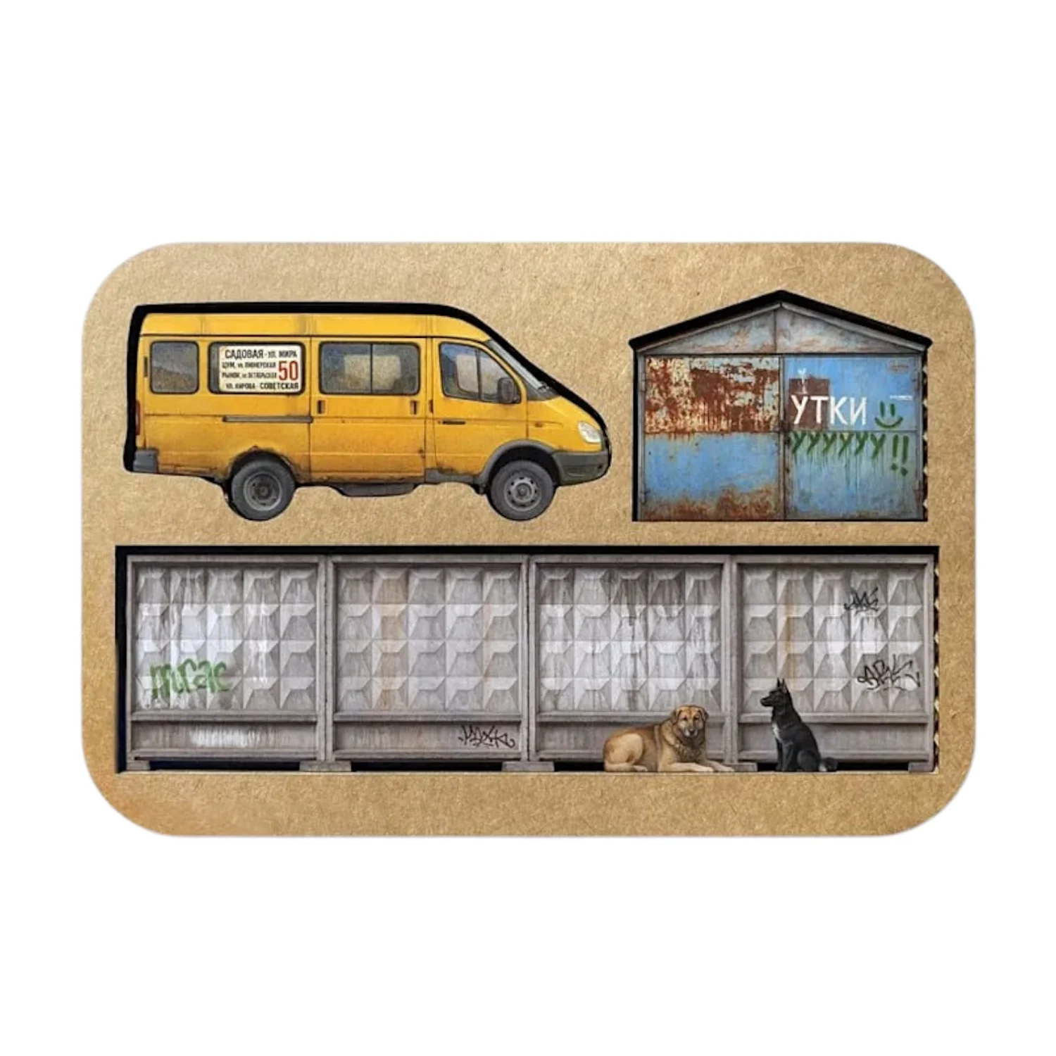 Мини-набор магнитов из серии "Выросли и уехали". Маршрутка с родными остановками, гараж с надписью “УТКИ-у-у-у”, и забор с дворовыми псами. Узнаваемые образы для тех, кто помнит свой двор, свой район, своё детство. Микро-ностальгия на холодильнике. Сделано вручную.