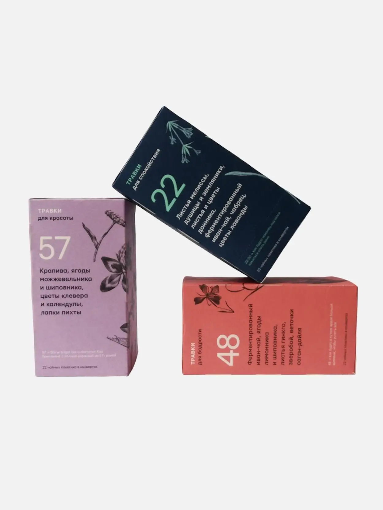 • Состав: Травки для спокойствия: Листья мелиссы, душицы, донника и земляники, ферментированный иван-чай, чабрец, цветы лаванды. Травки для бодрости: Ферментированный иван-чай, ягоды лимонника, листья гинкго билоба, плоды шиповника, зверобой, веточки саган-дайля. Травки для красоты: Крапива, ягоды можжевельника и шиповника, цветы клевера и календулы, лапки пихты.