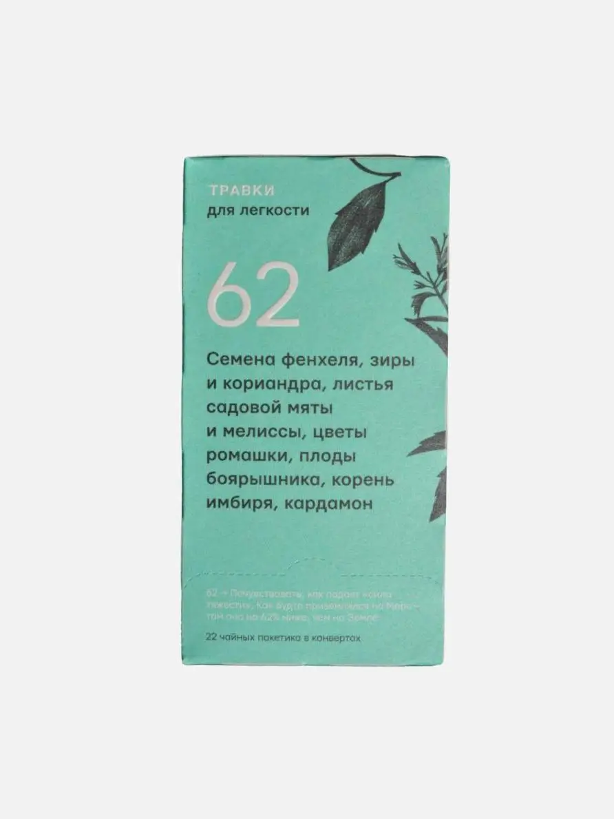 Набор включает в себя травки для легкости, которые помогут улучшить пищеварение и придать ощущение легкости после тяжелого обеда. Этот чай состоит наполовину из специй и наполовину из трав, что придает ему пряный восточный аромат и свежесть мяты и мелиссы. Он также поможет ускорить обмен веществ и поддержать пищеварение.