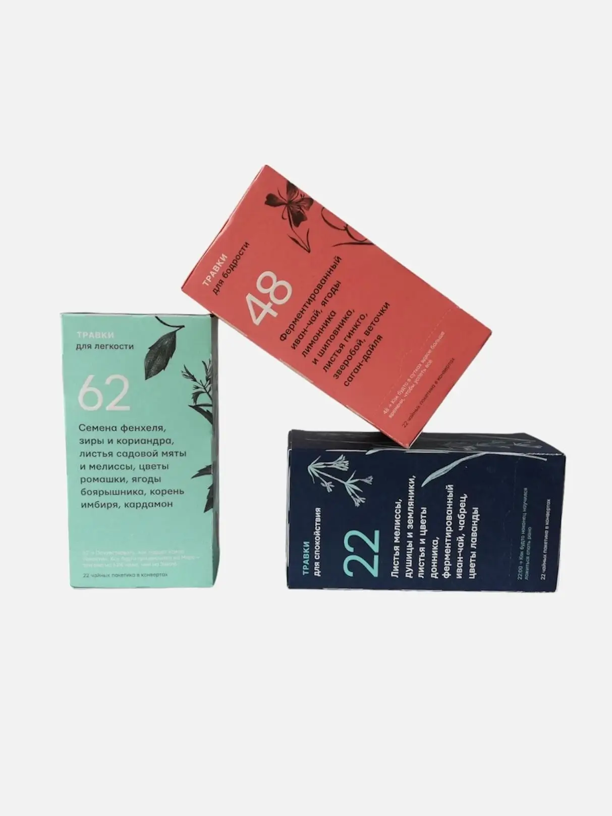 • Состав: Травки для спокойствия: Листья мелиссы, душицы, донника и земляники, ферментированный иван-чай, чабрец, цветы лаванды. Травки для бодрости: Ферментированный иван-чай, ягоды лимонника, листья гинкго билоба, плоды шиповника, зверобой, веточки саган-дайля. Травки для легкости: Семена фенхеля, зиры и кориандра, листья садовой мяты и мелиссы, цветы ромашки, плоды боярышника, корень имбиря, кардамон.