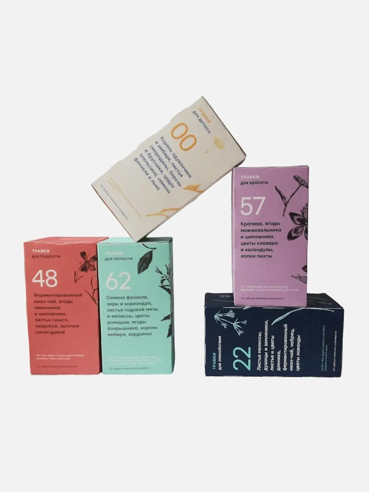 Набор травяного чая «Травки для спокойствия, для легкости, для бодрости, для детокса, для красоты» состоит из 5 пачек чая.