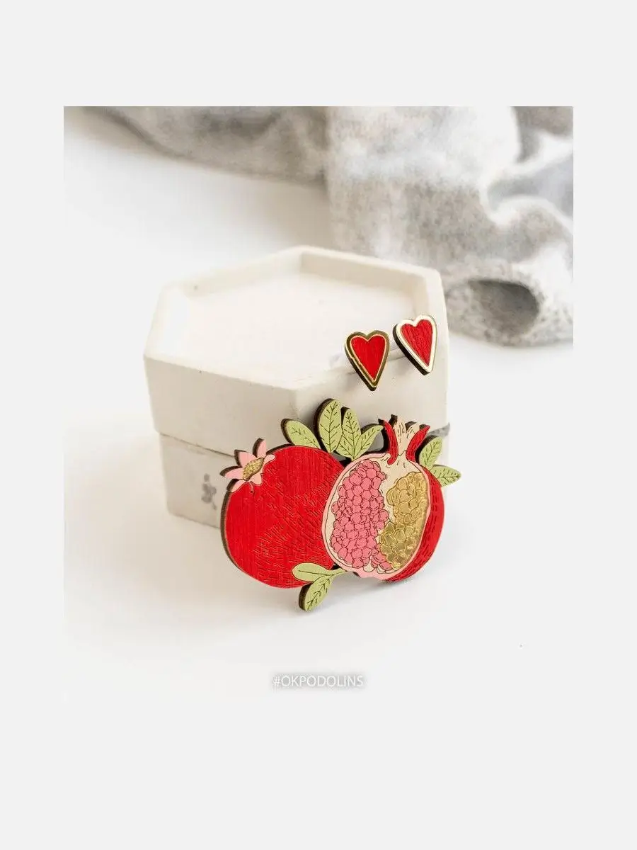 Брошь выполнена в виде спелых гранатов,  которые символизируют страсть и энергию. Сережки в форме сердечек добавляют нежности и романтики.