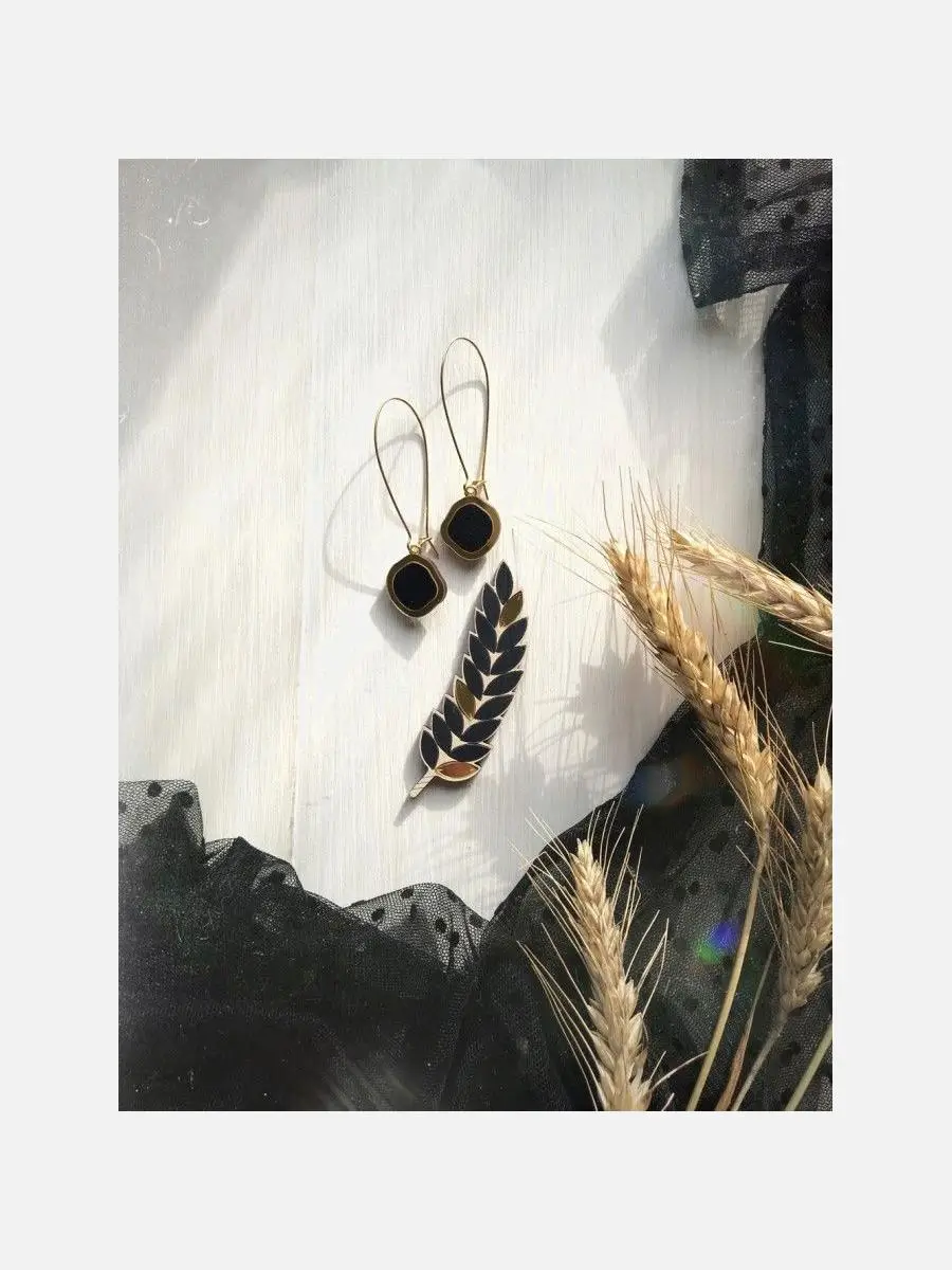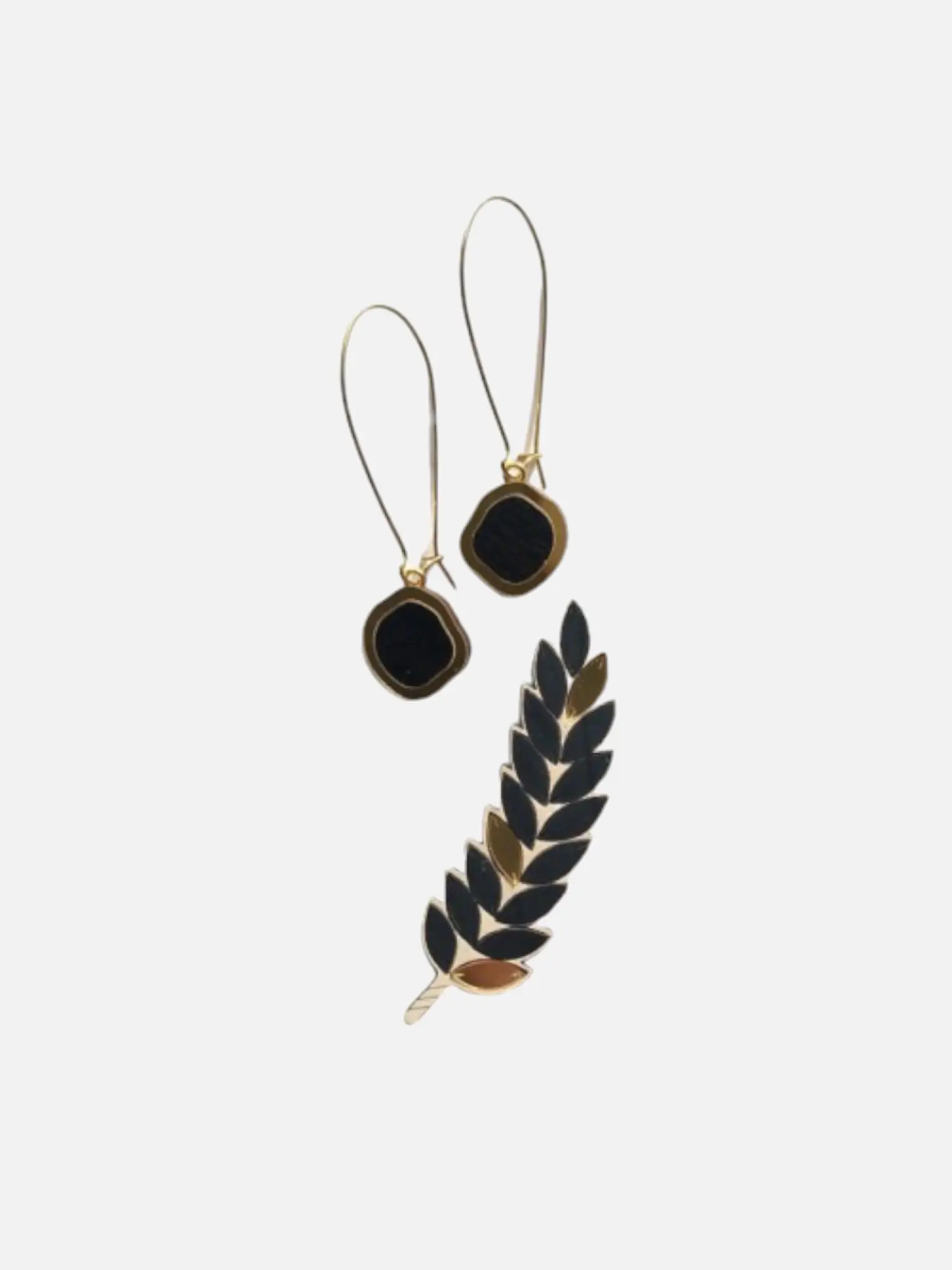 Набор украшений ручной работы брошь «Колосок» и серьги «Озёра», чёрный, дерево