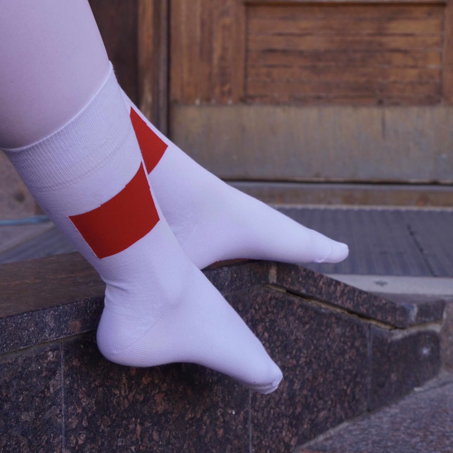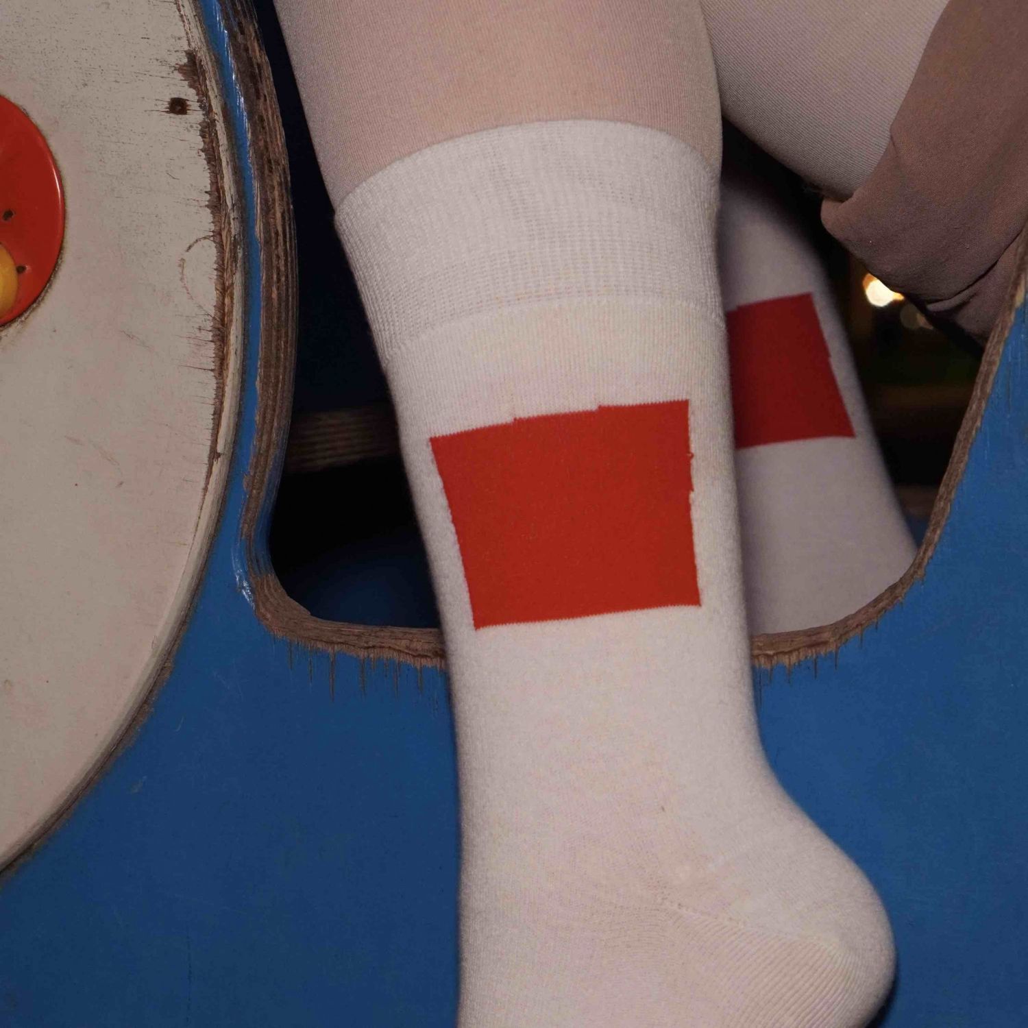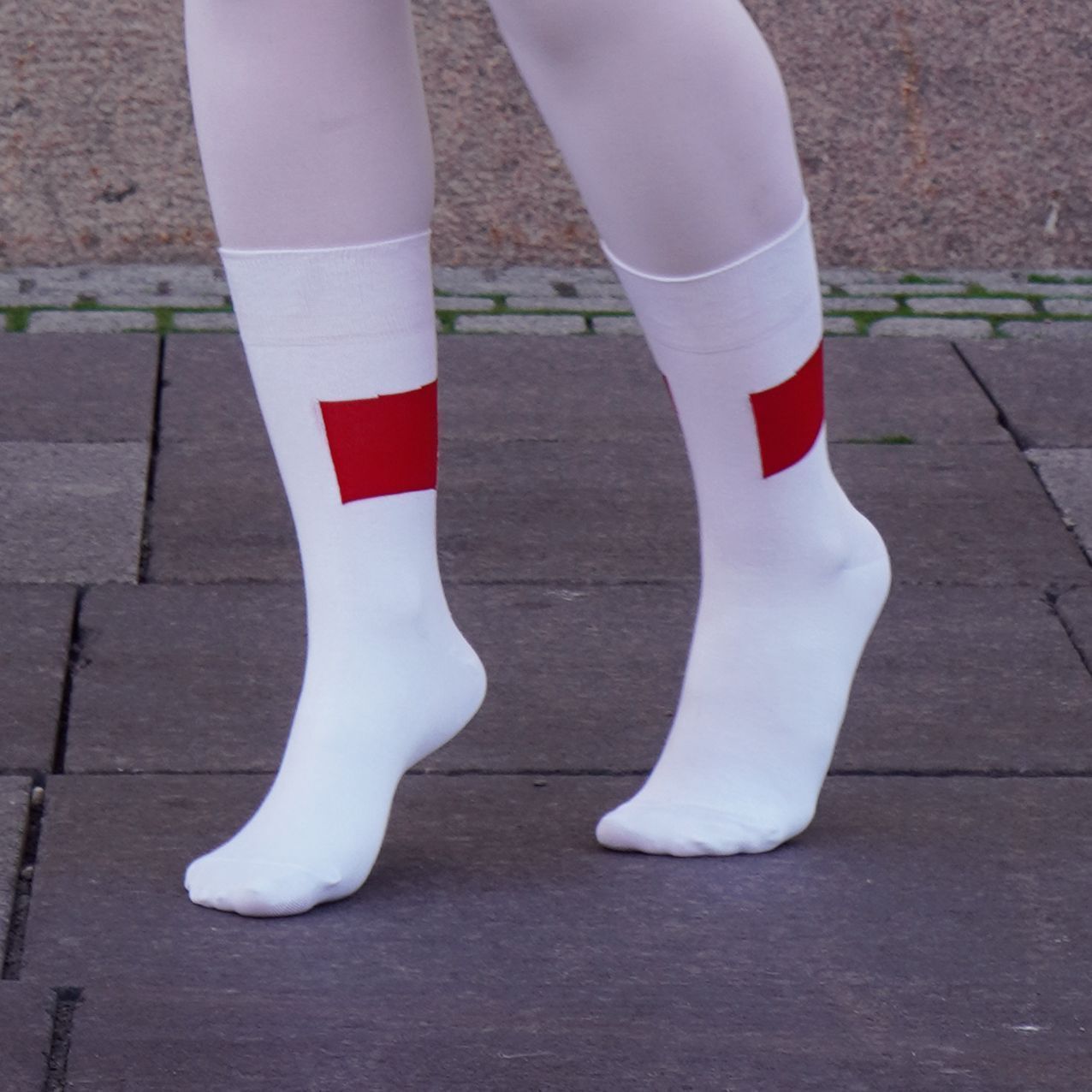 Знакомьтесь, перед вами ни что иное, как известная работа Казимира Малевича “Красный квадрат” из собрания Русского музея. Черный квадрат мы давно переосмыслили на носочный лад, а теперь нашли местечко и для его алого товарища. Не поверите, но на самом деле это не красный квадрат, а образ крестьянки в красном сарафане. Может поэтому в художественных ВУЗах учатся целых шесть лет, чтобы понимать истинный художественный замысел? Творчество великого мастера вне времени, поэтому мы и позаимствовали его в свою носочную семью.